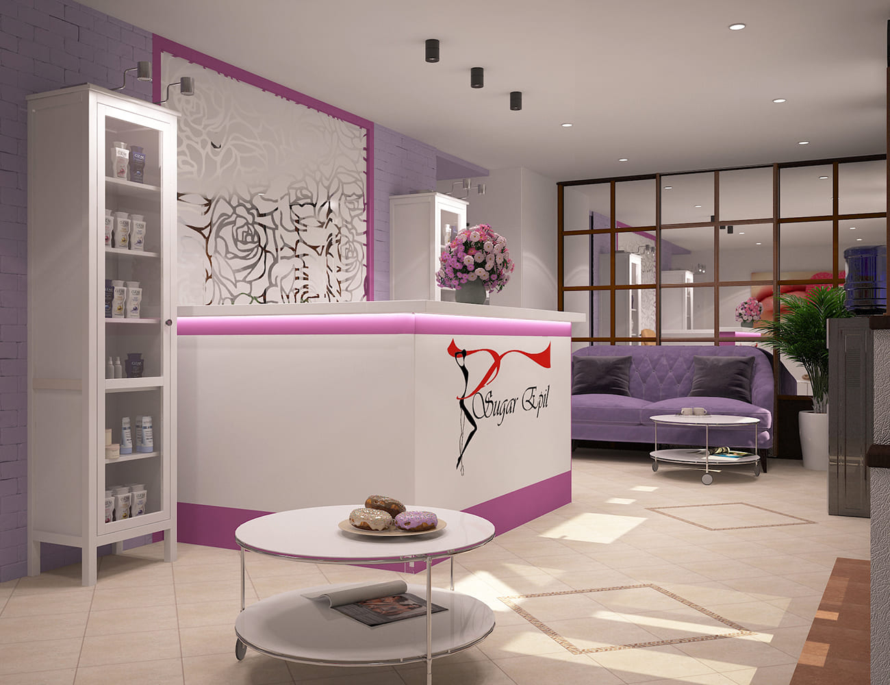 Ресепшн в салоне красоты играет ключевую роль. Это первое, что видит клиент, и от этого зависит его первое впечатление. В нашем проекте стойка ресепшн оформлена в белом цвете с пурпурными вставками. Такой контраст подчеркивает стильность и современность, создавая сразу ощущение уюта и профессионализма. Светодиодное освещение подчеркивает контуры мебели, а стильные детали делают пространство более ярким и привлекательным.