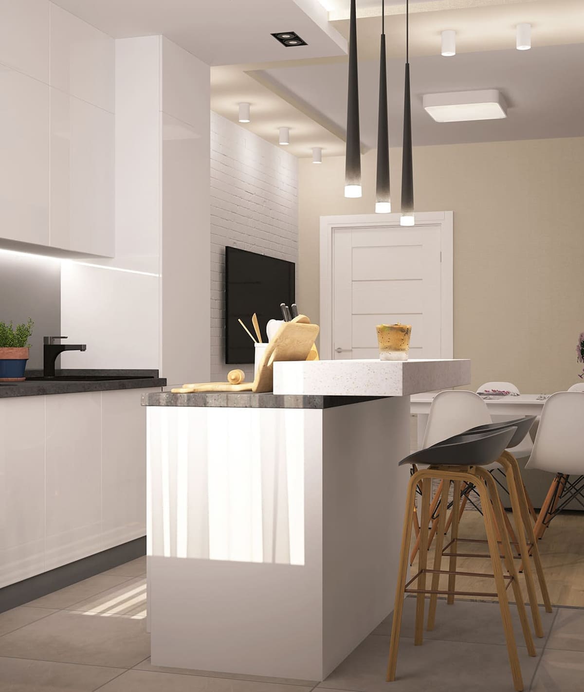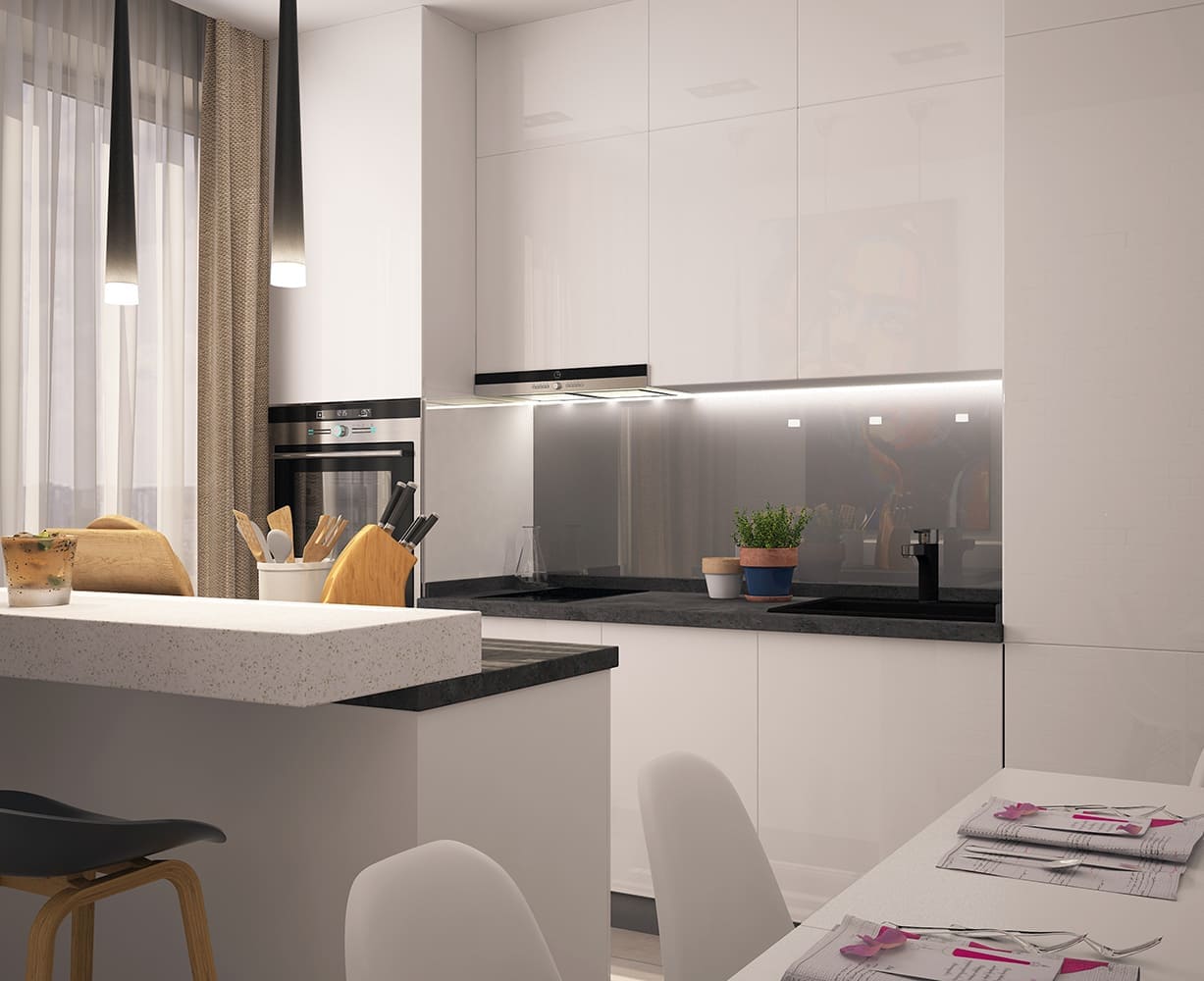 Особое внимание стоит уделить кухне, выполненной в минималистичном стиле. Белые фасады с контрастной чёрной столешницей создают элегантный, но сдержанный образ. Контраст между светлым и тёмным подчеркивает современность и гармонию пространства. Барная стойка, которая является не только функциональным элементом, но и ярким акцентом, разделяет кухню и гостиную зоны, придавая интерьеру особый стиль.