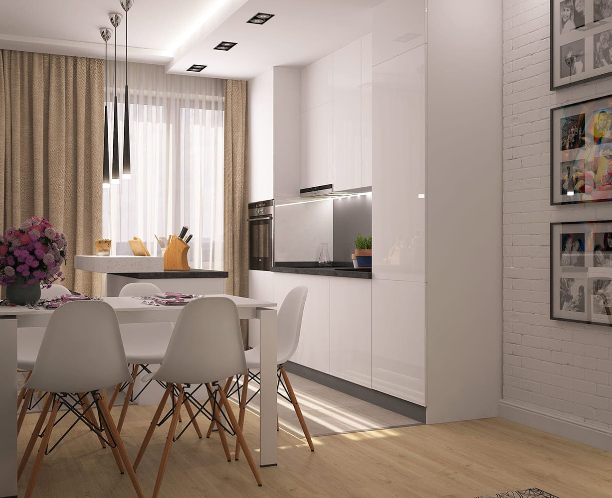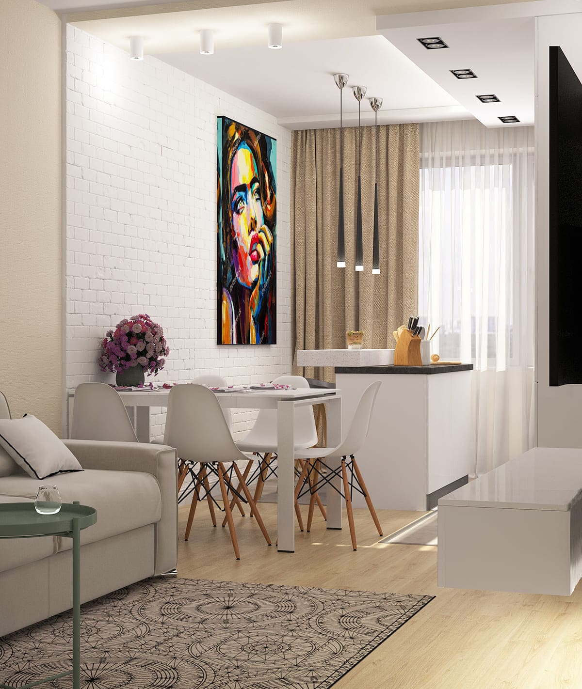 Дизайн кухни-гостиной – ключевой элемент современного интерьера, который должен сочетать в себе функциональность и стиль. В данном проекте гармонично сочетаются элементы минимализма с яркими акцентами, что позволяет создать пространство, которое идеально подходит для комфортной жизни. Основные цвета интерьера — белый и бежевый, а яркие декоративные элементы и картины привносят в пространство динамичность и энергичность. Такой дизайн кухни-гостиной подойдет для тех, кто ценит современность, но при этом не хочет отказываться от уютных и ярких деталей.
