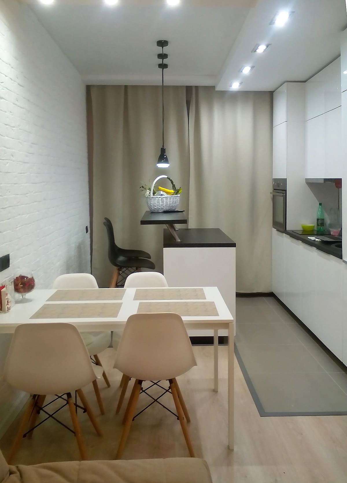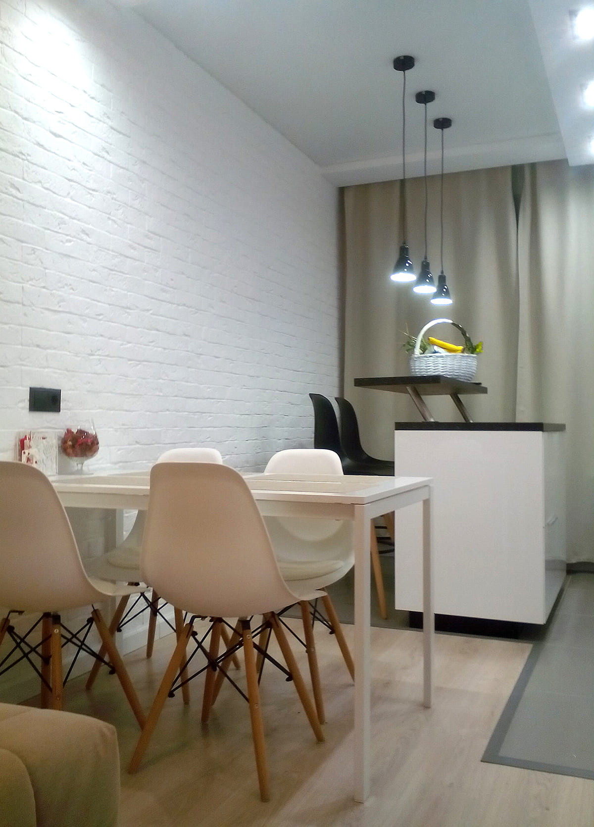 Невозможно не отметить стильные чёрные минималистичные подвесные светильники, которые идеально подходят для кухни-гостиной. Эти светильники не только обеспечивают необходимое освещение, но и становятся важным элементом декора, придающим пространству современный вид. В качестве акцента на стенах используется белый декоративный кирпич, который придаёт интерьеру текстуру и визуальный объём, создавая современную атмосферу.
