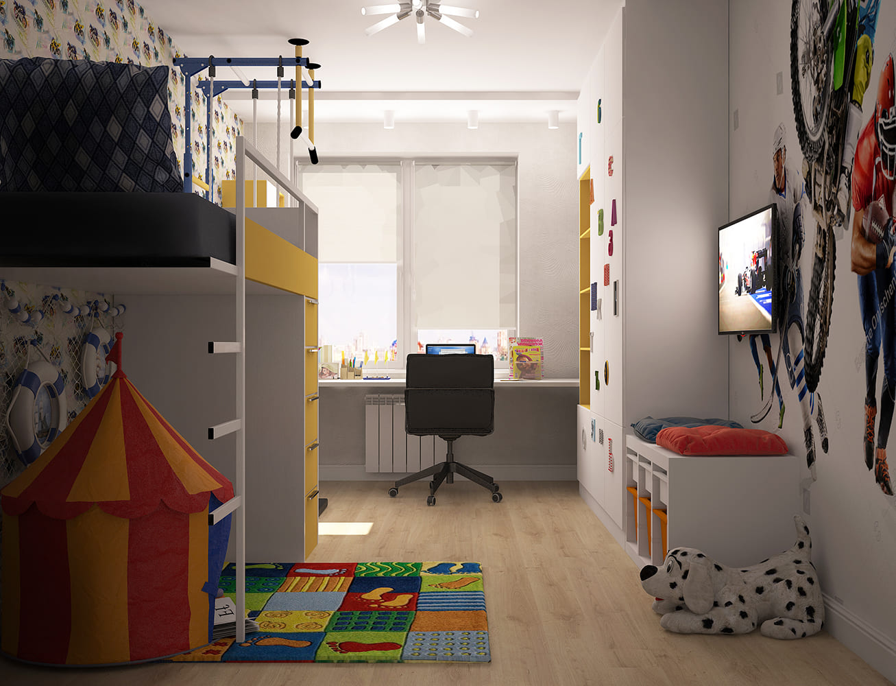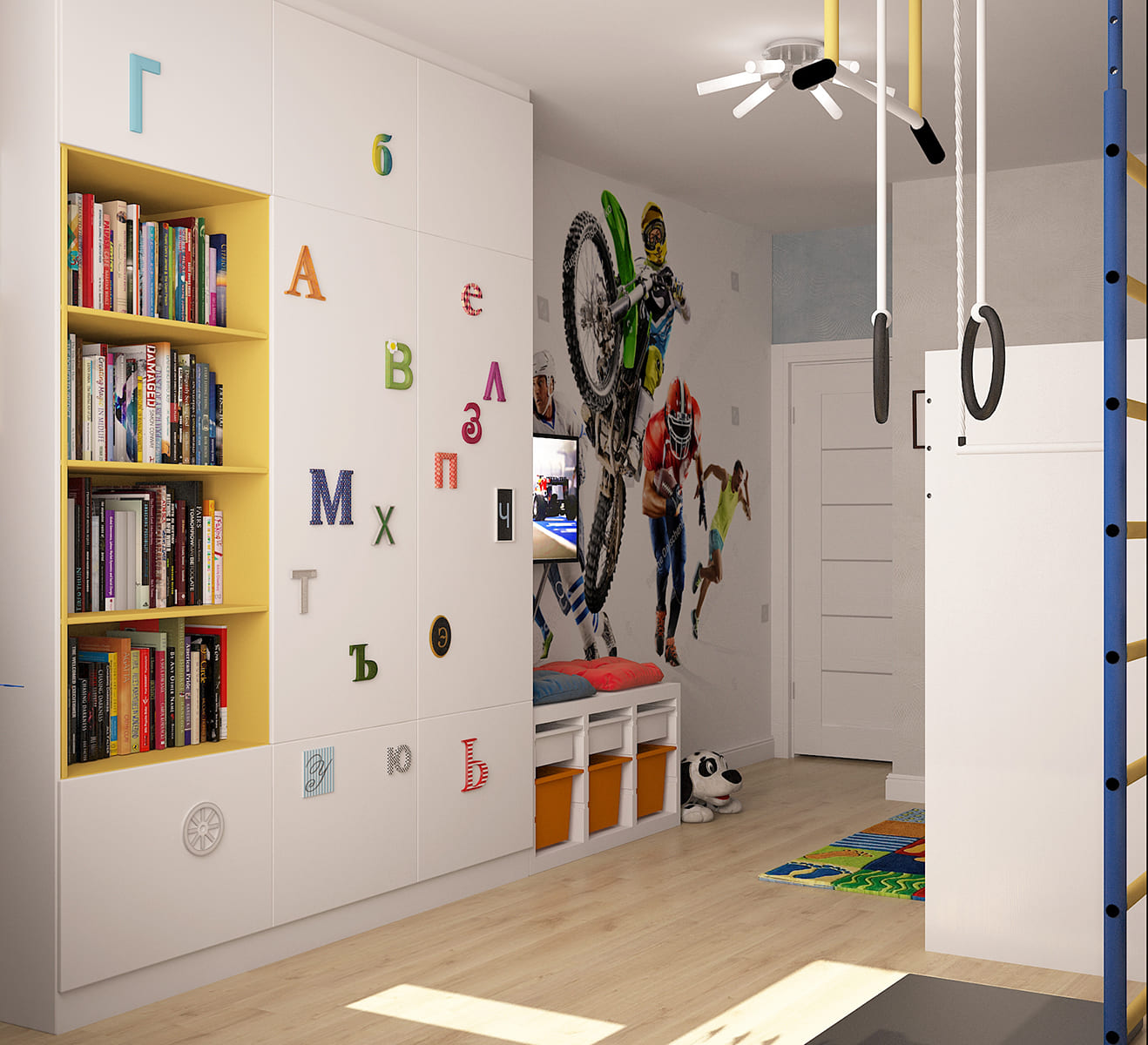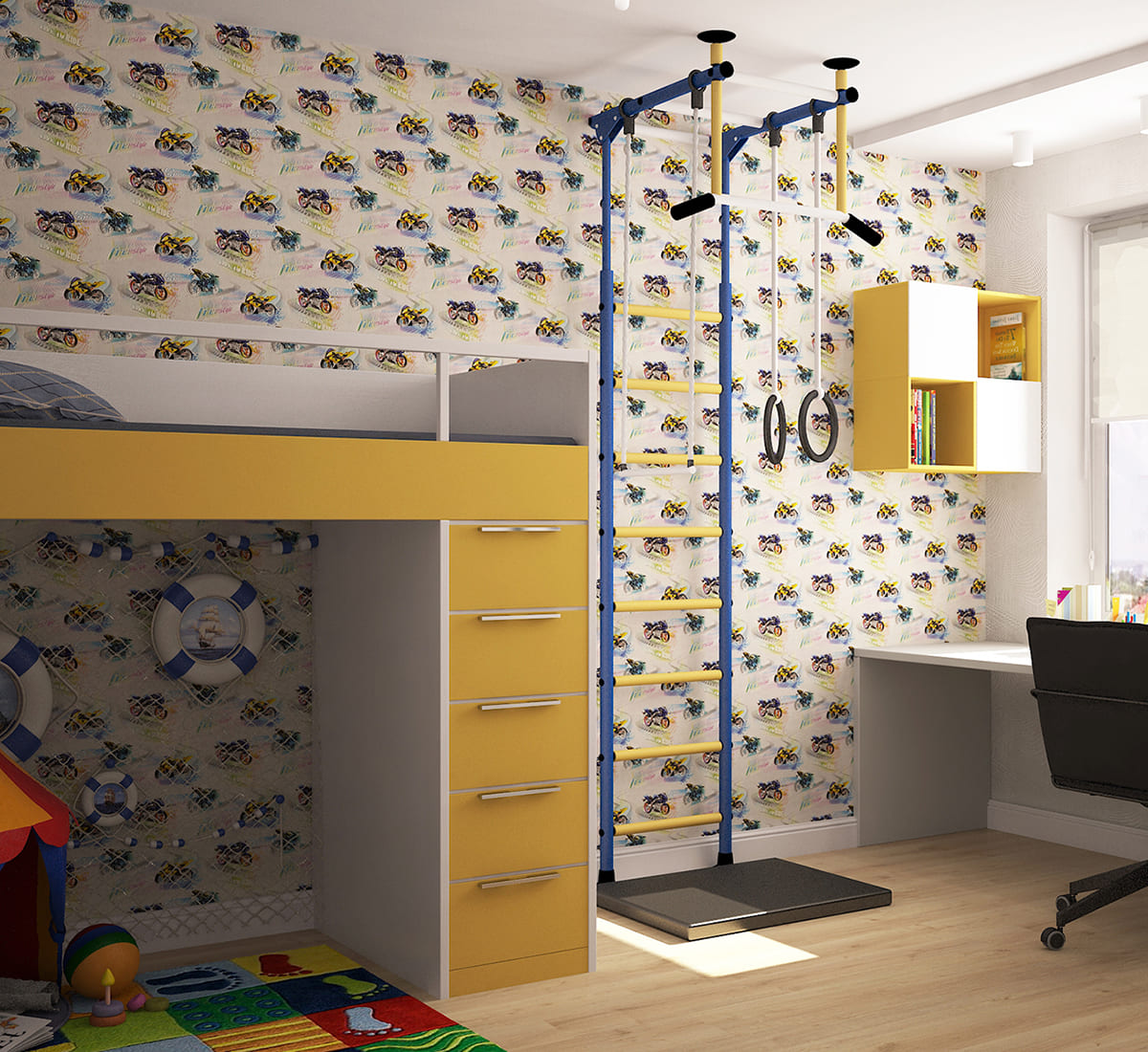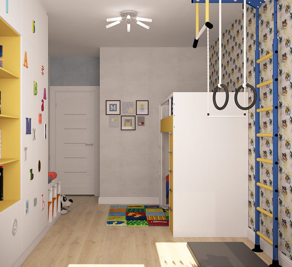 Этот проект идеально подойдет для родителей, которые хотят создать пространство, где ребенок будет не только играть, но и развиваться, обучаться и заниматься спортом. Простой, но яркий интерьер с элементами для активного отдыха и обучения сделает комнату не только красивой, но и полезной для ребенка.