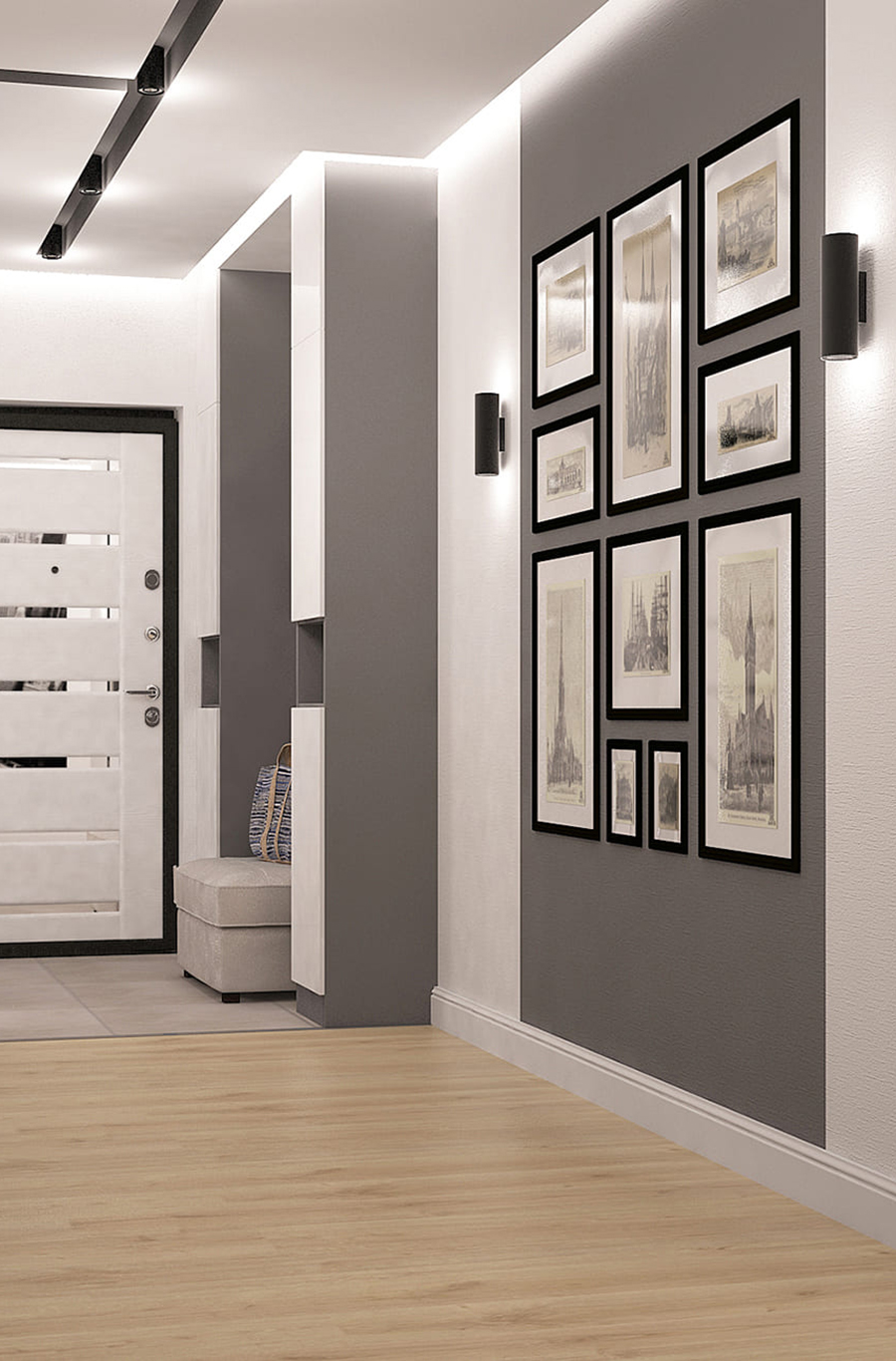 Четвертая картинка представляет собой коридор, где акцент сделан на стенах, украшенных художественными картинами. Важную роль в оформлении играет правильное освещение, которое подчеркивает каждый элемент декора. Картины в черных рамках на серых стенах создают изысканный контраст и придают коридору индивидуальность, не перегружая пространство.