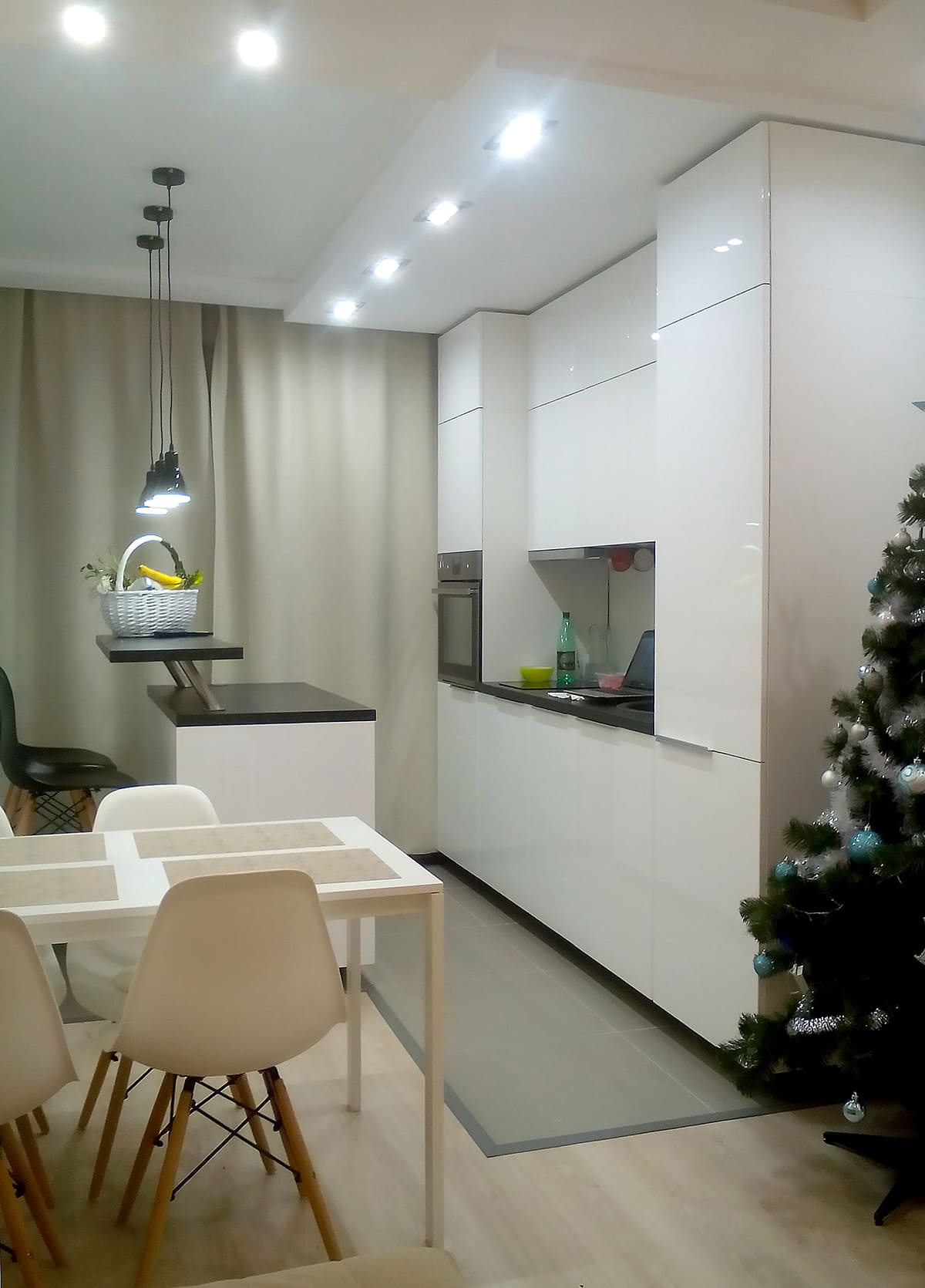 Дизайн кухни-гостиной: белые фасады и чёрные акценты