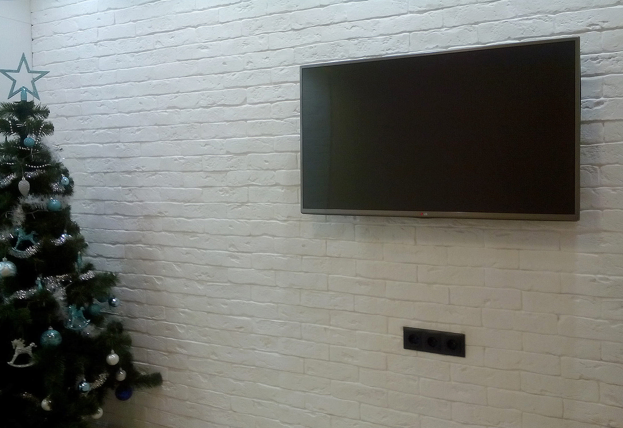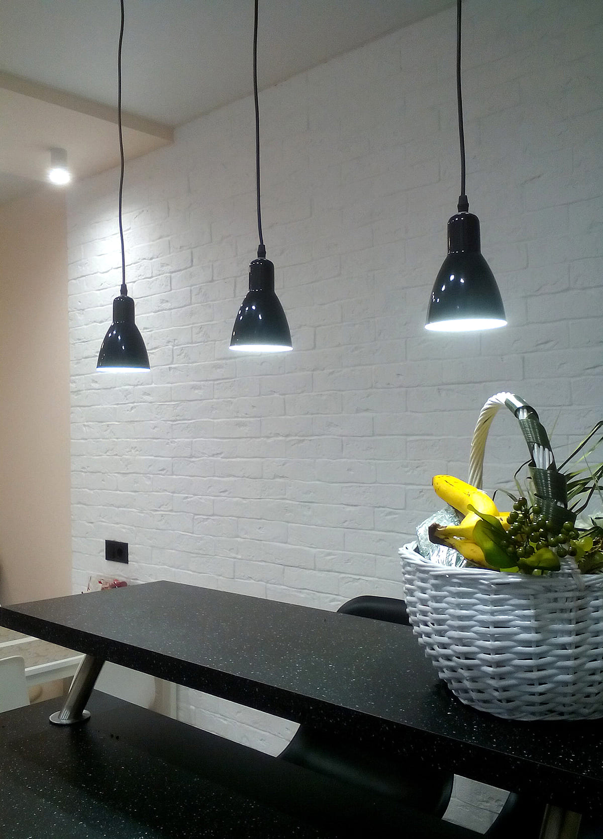 Стильные чёрные минималистичные светильники и белый декоративный кирпич
