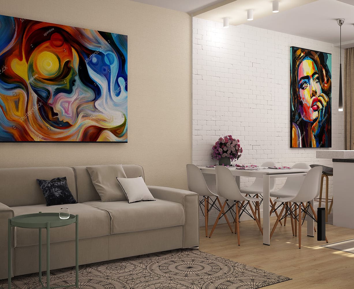 Яркие картины на стенах становятся акцентом и придают интерьеру динамичность и индивидуальность. Картины в стиле поп-арт или абстракционизм, выполненные в ярких цветах, идеально сочетаются с нейтральной палитрой комнаты, создавая контраст и подчёркивая стиль минимализма.