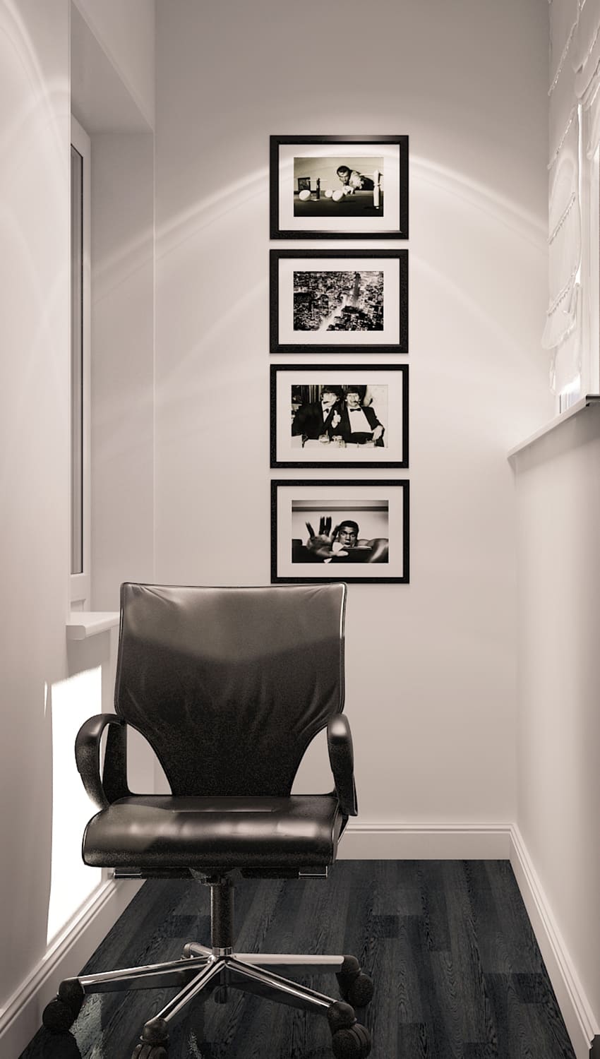 Использование темного пола в сочетании с белыми стенами и светлыми деталями делает интерьер визуально более просторным. Важно, что благодаря грамотному освещению и минимализму в декоре, кабинет выглядит стильным и не перегруженным лишними деталями. Это идеальный вариант для тех, кто ценит порядок и организованность.