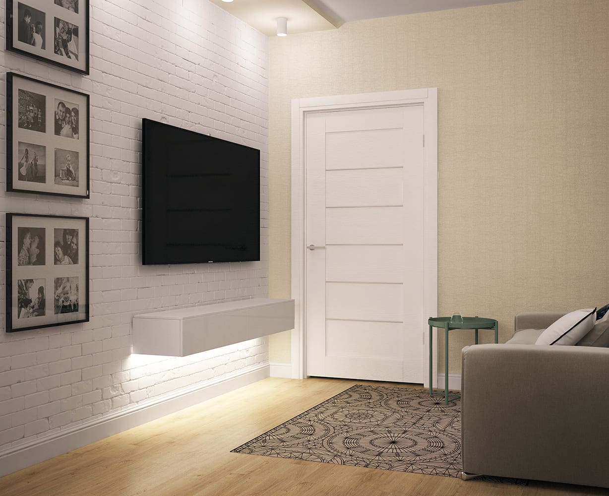 Третий снимок демонстрирует элегантные белые двери с металлизированными вставками, которые гармонично вписываются в современный стиль. Эти двери идеально подходят для коридора в стиле минимализм, поскольку они не перегружают пространство, но при этом становятся важным элементом дизайна. Стильные светильники вдоль стен создают мягкое освещение, подчеркивающее чистоту линий и общую гармонию интерьера.