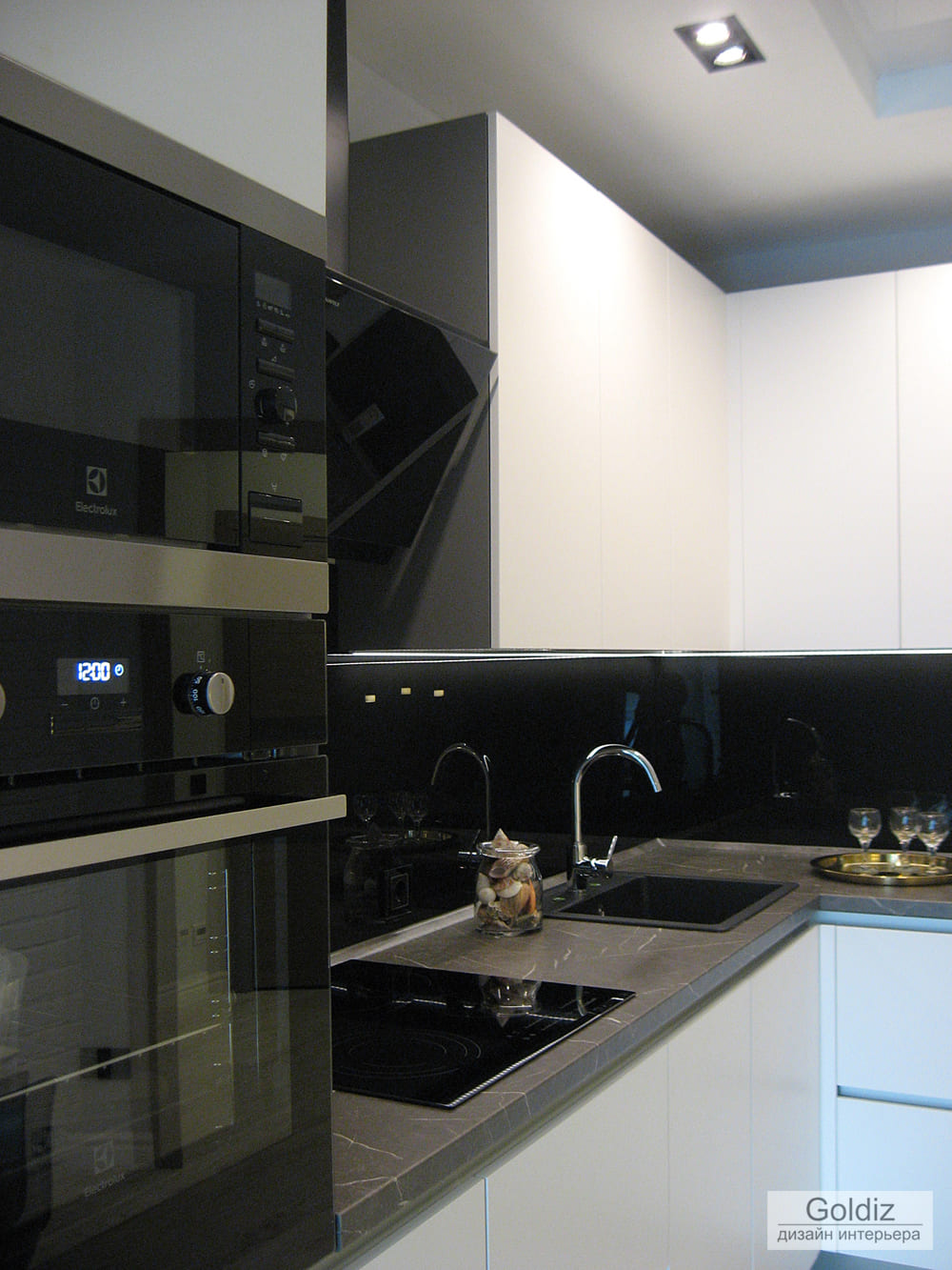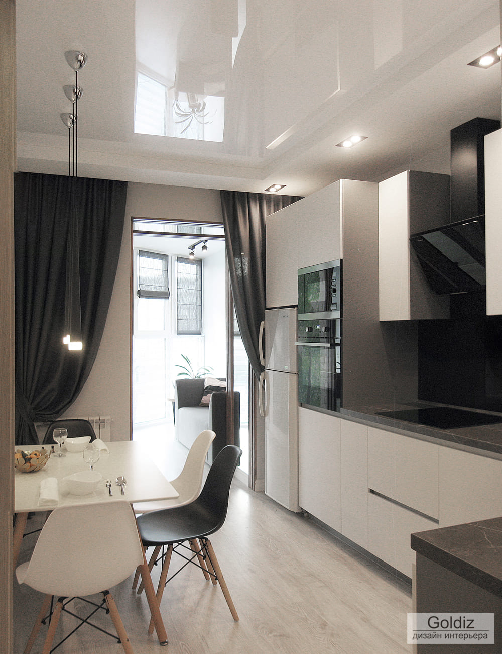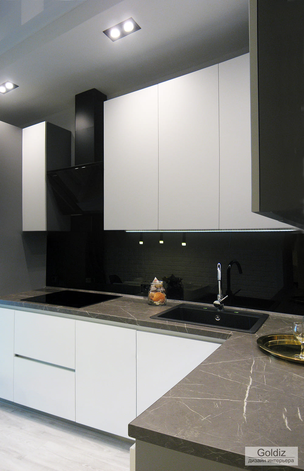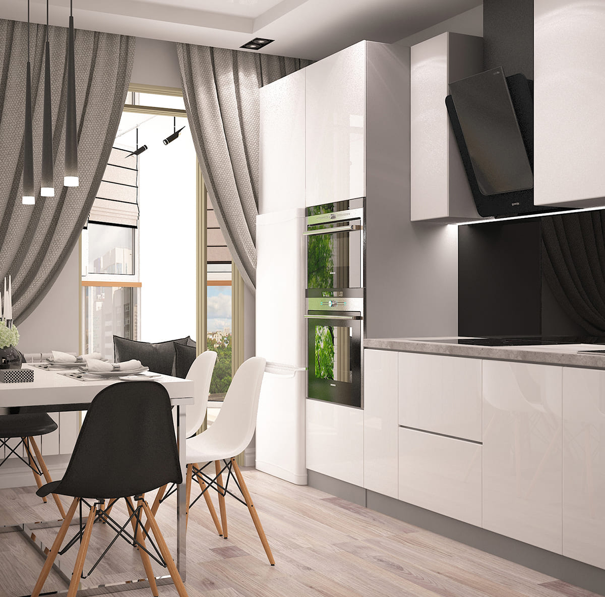Для дизайна кухни, балкона и прихожей за основу было взято контрастное сочетание белого, серого и черного, а также игра разных фактур ( гладких матовых стен, жесткого, брутального декоративного камня, глянцевых кухонных фасадов и отражающего черного закаленного стекла на фартуке). Получился очень стильный и современный интерьер.