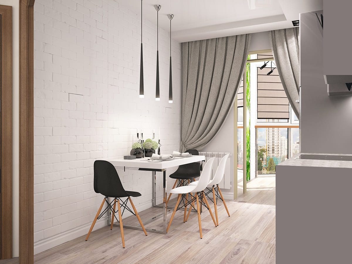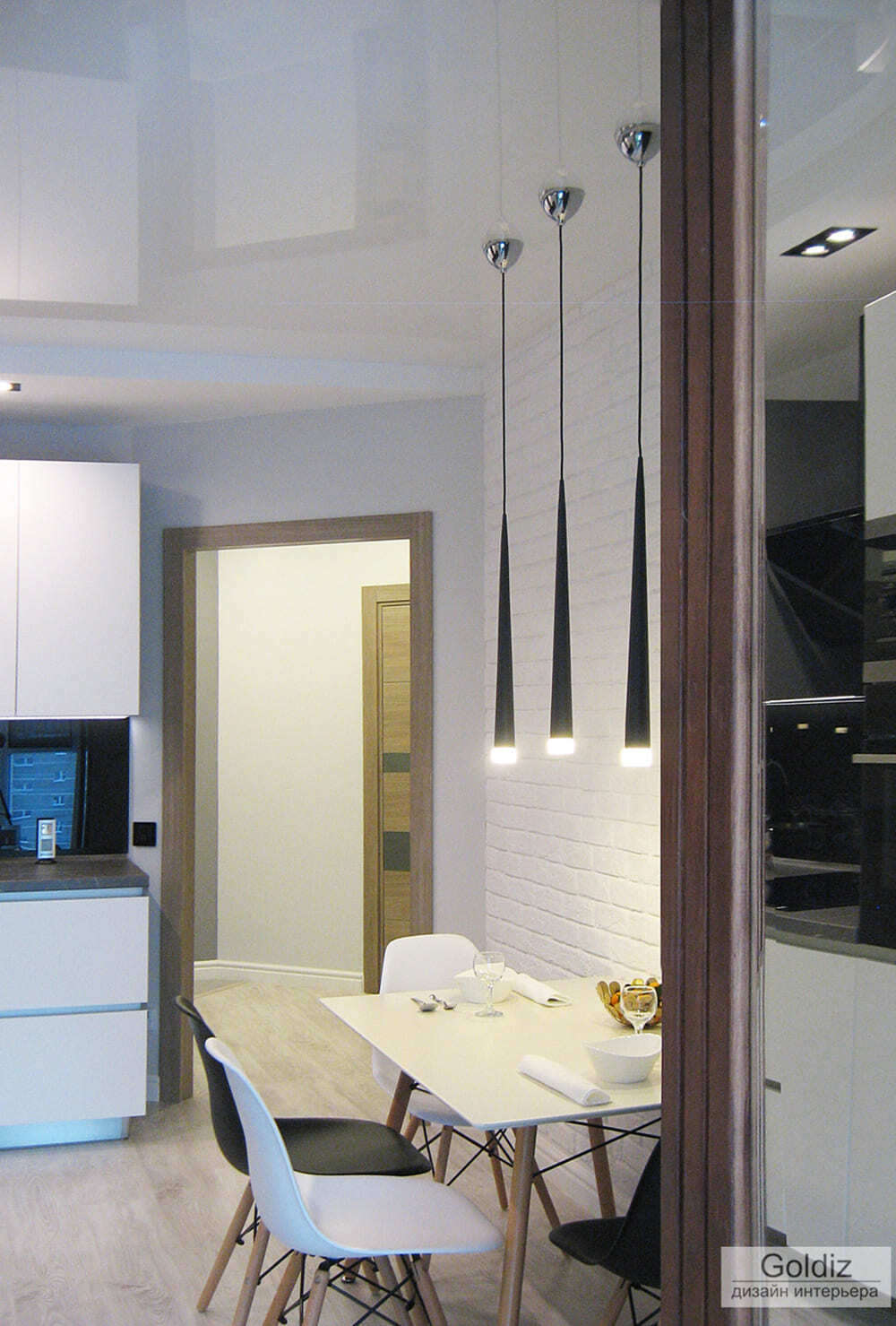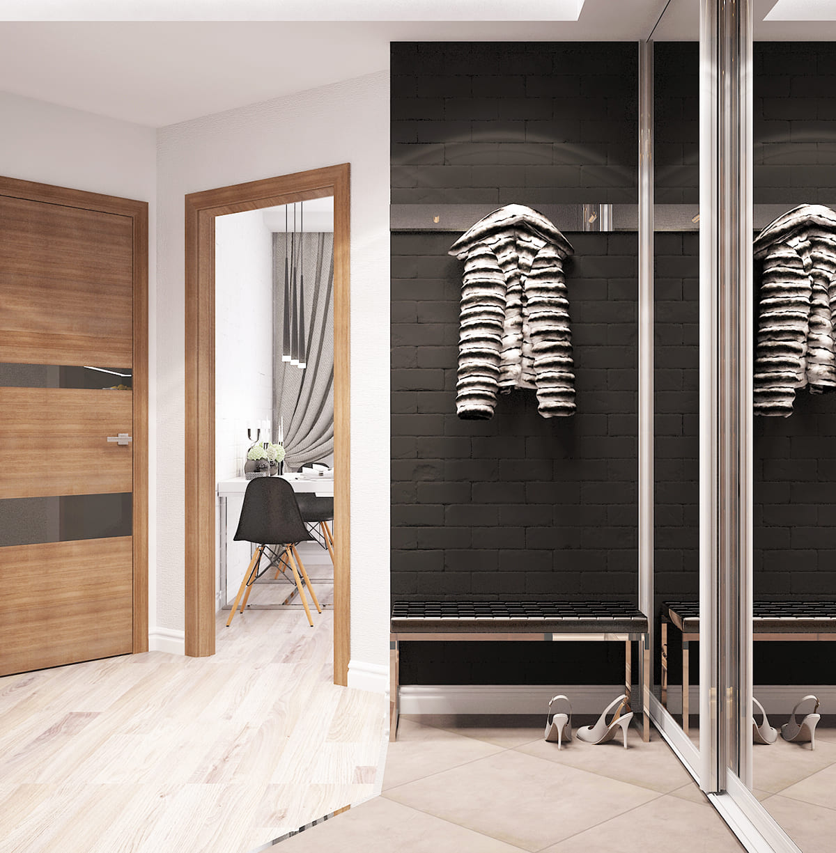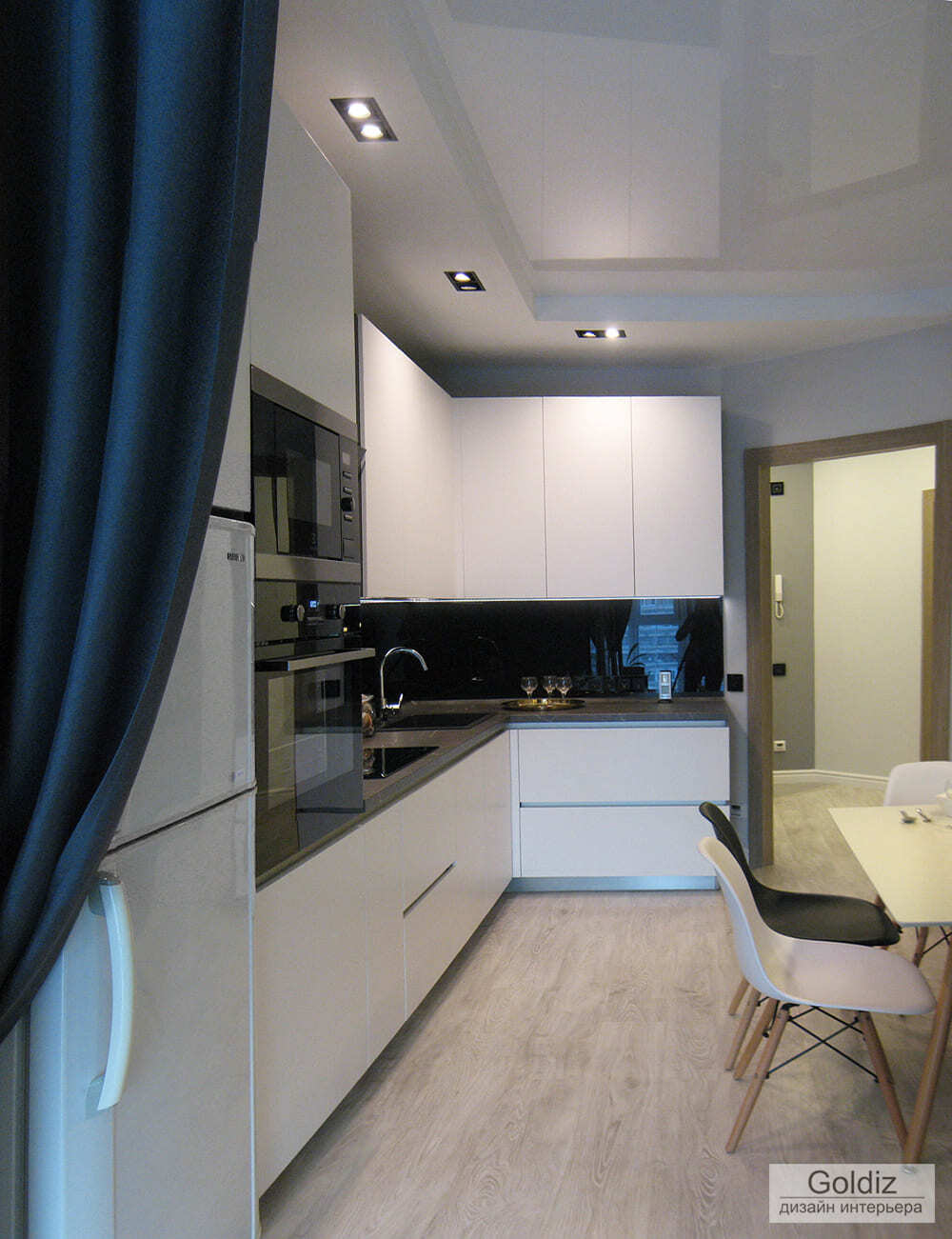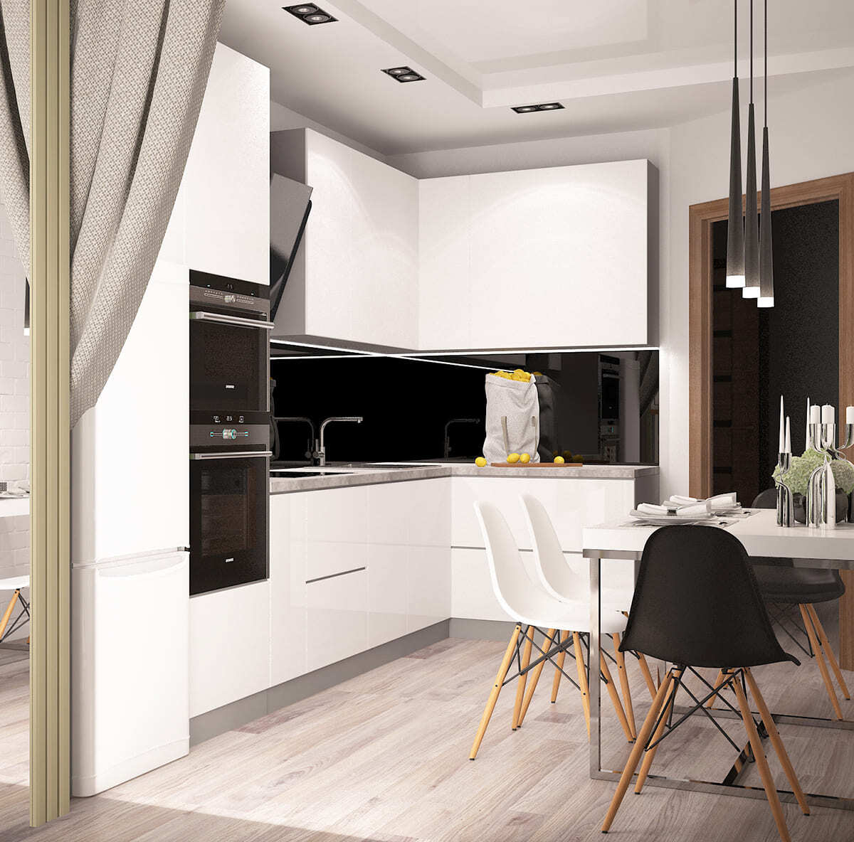 Для дизайна кухни, балкона и прихожей за основу было взято контрастное сочетание белого, серого и черного, а также игра разных фактур ( гладких матовых стен, жесткого, брутального декоративного камня, глянцевых кухонных фасадов и отражающего черного закаленного стекла на фартуке). Получился очень стильный и современный интерьер.