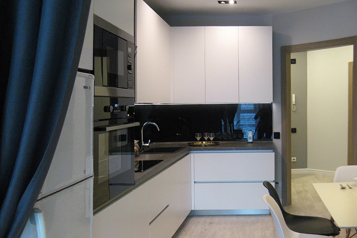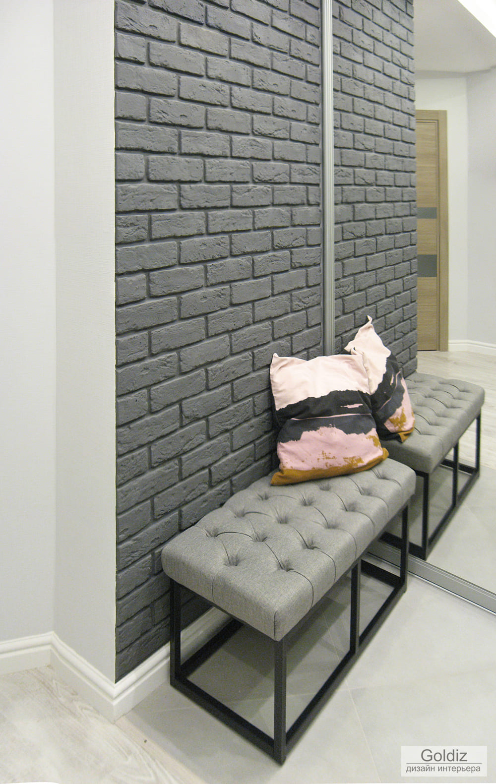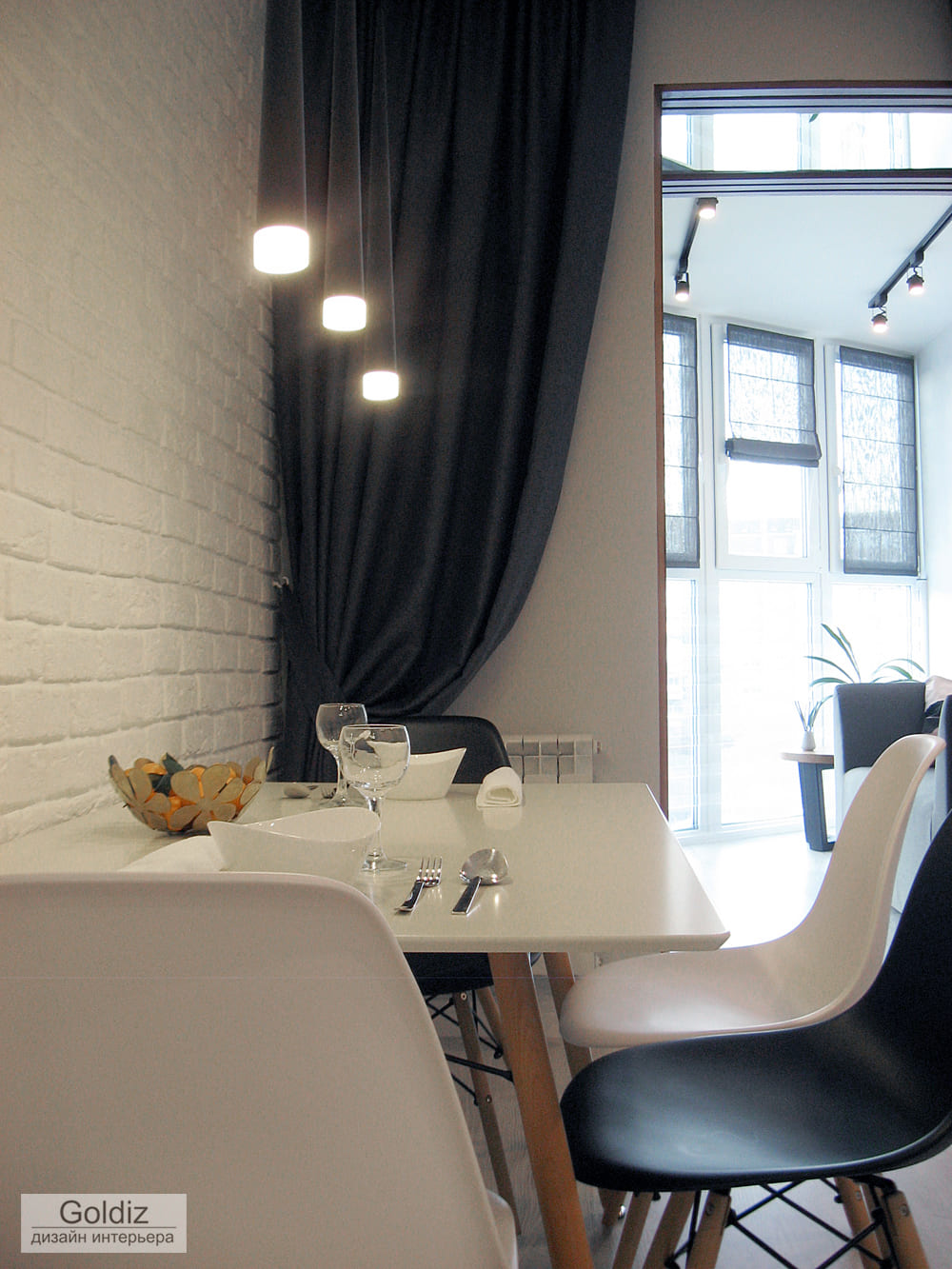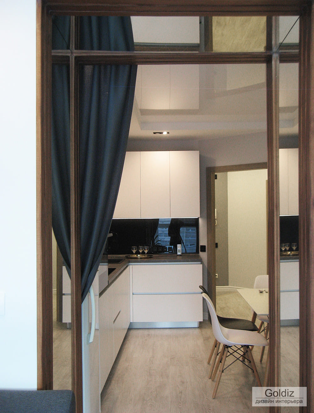 Для дизайна кухни, балкона и прихожей за основу было взято контрастное сочетание белого, серого и черного, а также игра разных фактур ( гладких матовых стен, жесткого, брутального декоративного камня, глянцевых кухонных фасадов и отражающего черного закаленного стекла на фартуке). Получился очень стильный и современный интерьер.