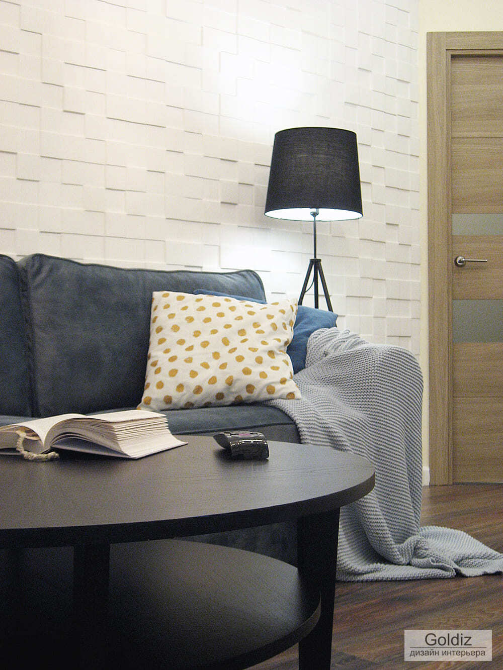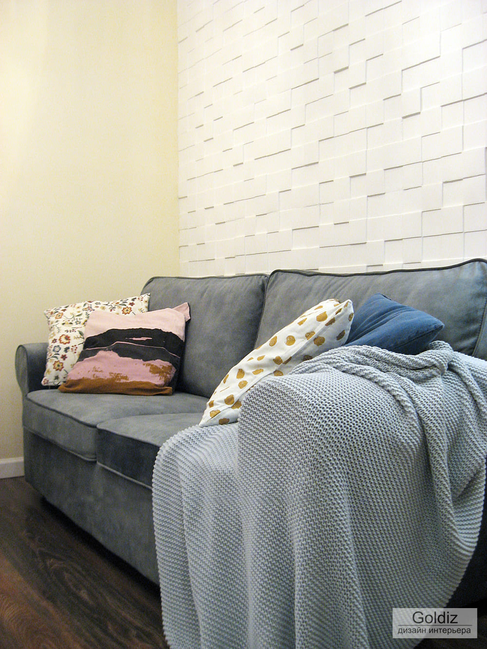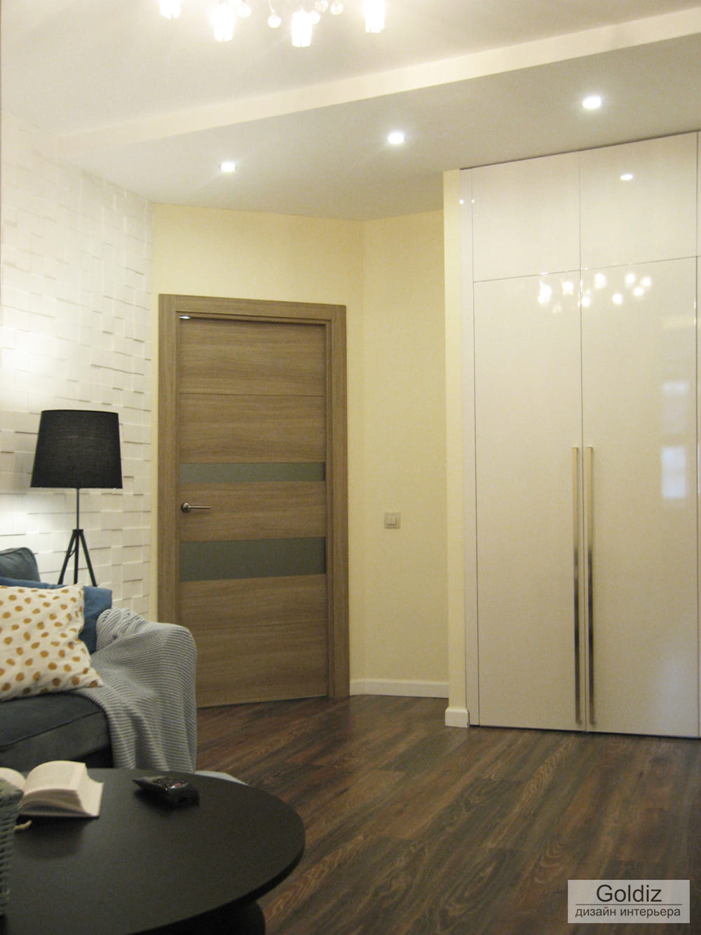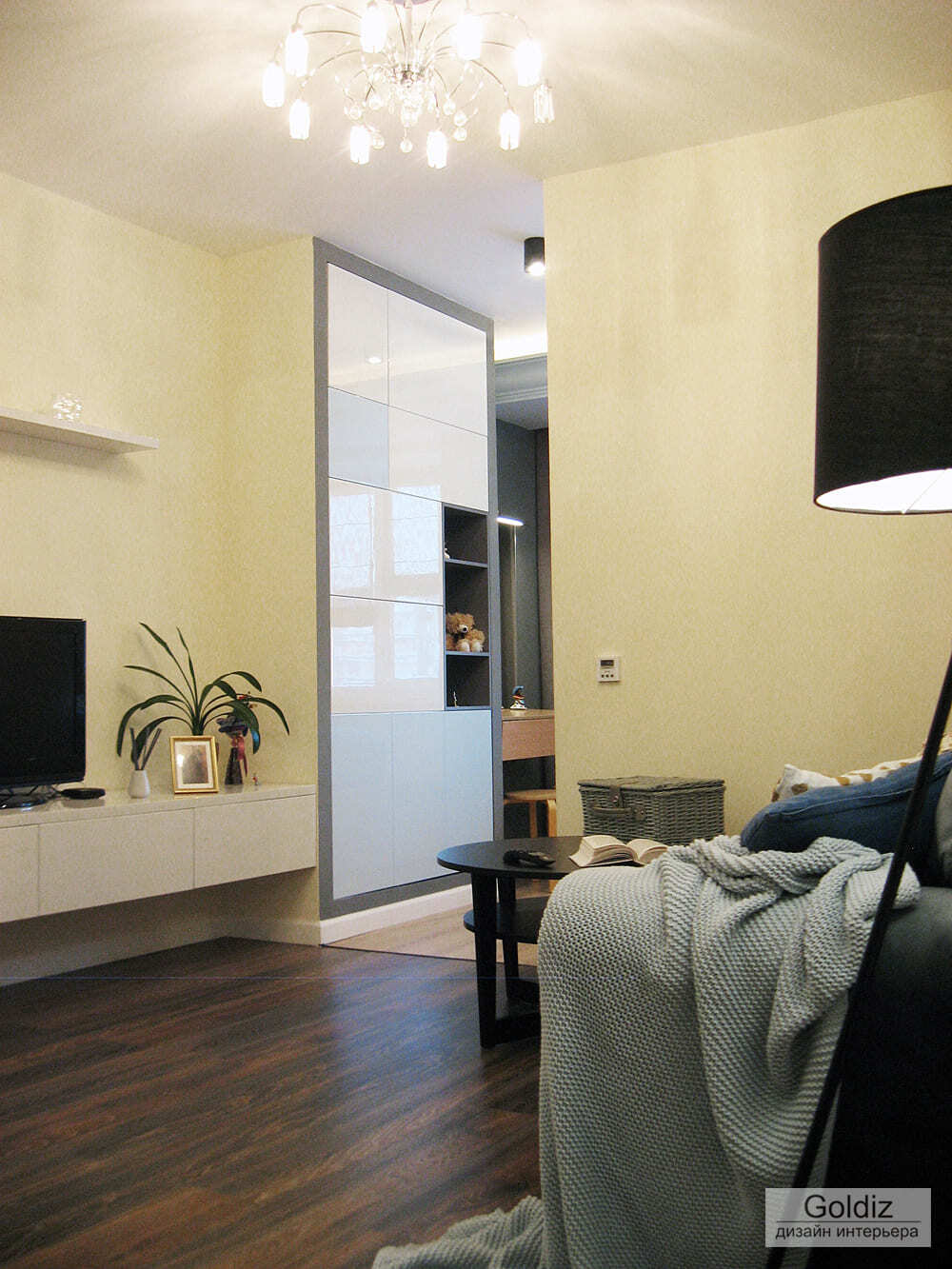 Дизайн студия Голдиз выполнила дизайн интерьера однокомнатной квартиры. При встречи на объекте было решено разделить гостиную на две зоны- гостиная и спальня, предусмотреть места для хранения крупных вещей. Предпочтения были отданы светлым тонам с яркими элементами декора.