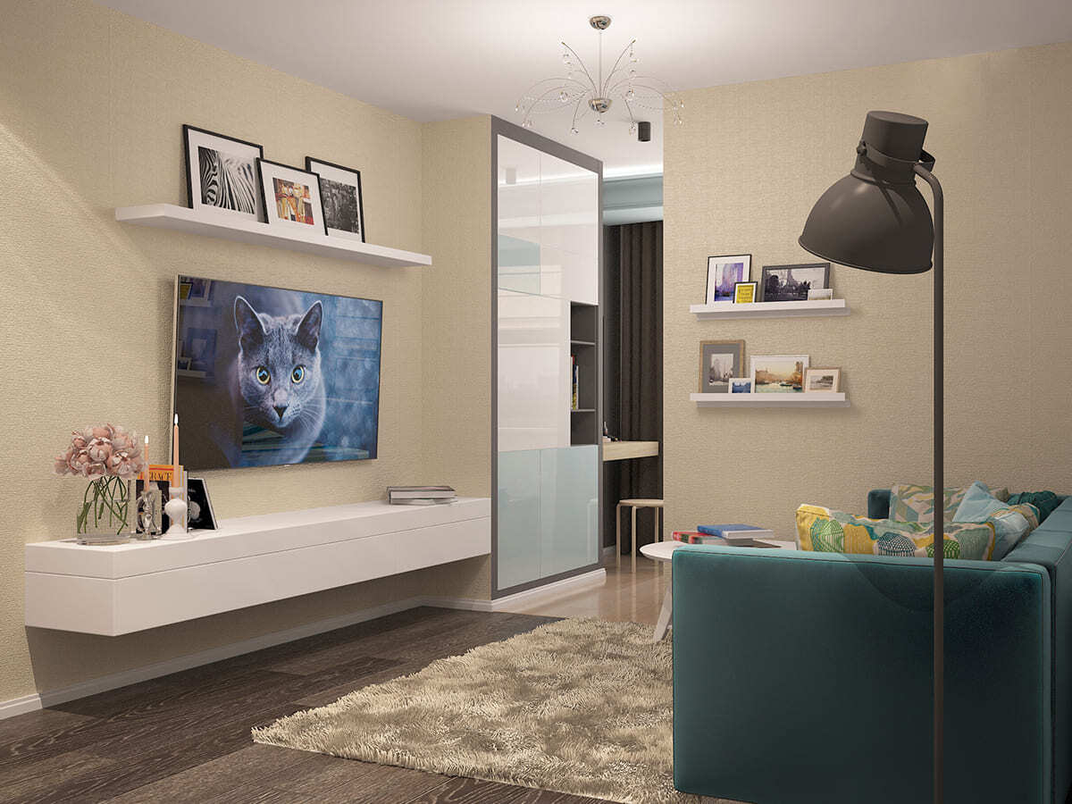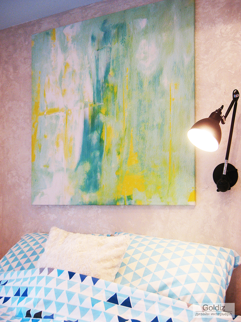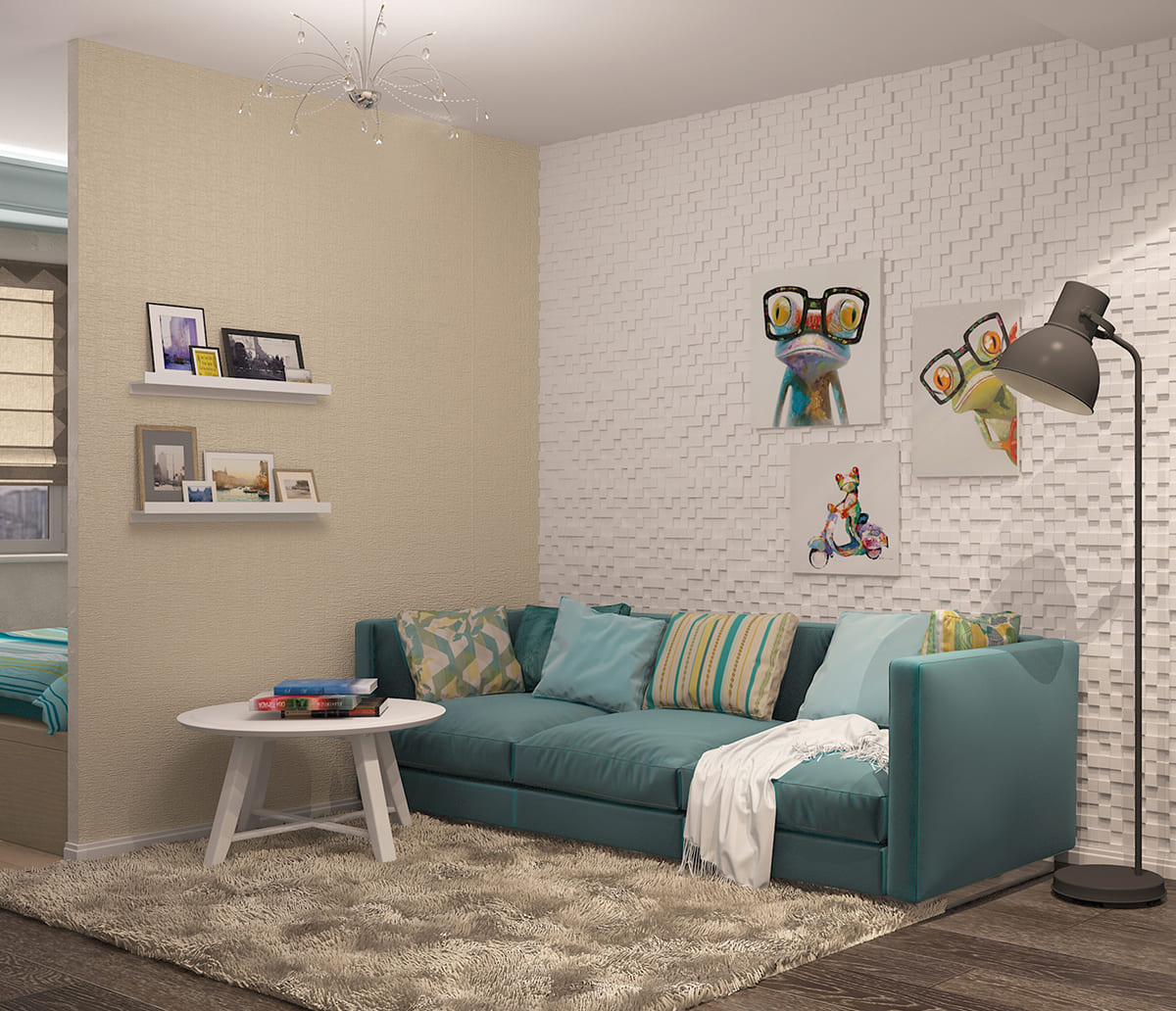 Дизайн студия Голдиз выполнила дизайн интерьера однокомнатной квартиры. При встречи на объекте было решено разделить гостиную на две зоны- гостиная и спальня, предусмотреть места для хранения крупных вещей. Предпочтения были отданы светлым тонам с яркими элементами декора.