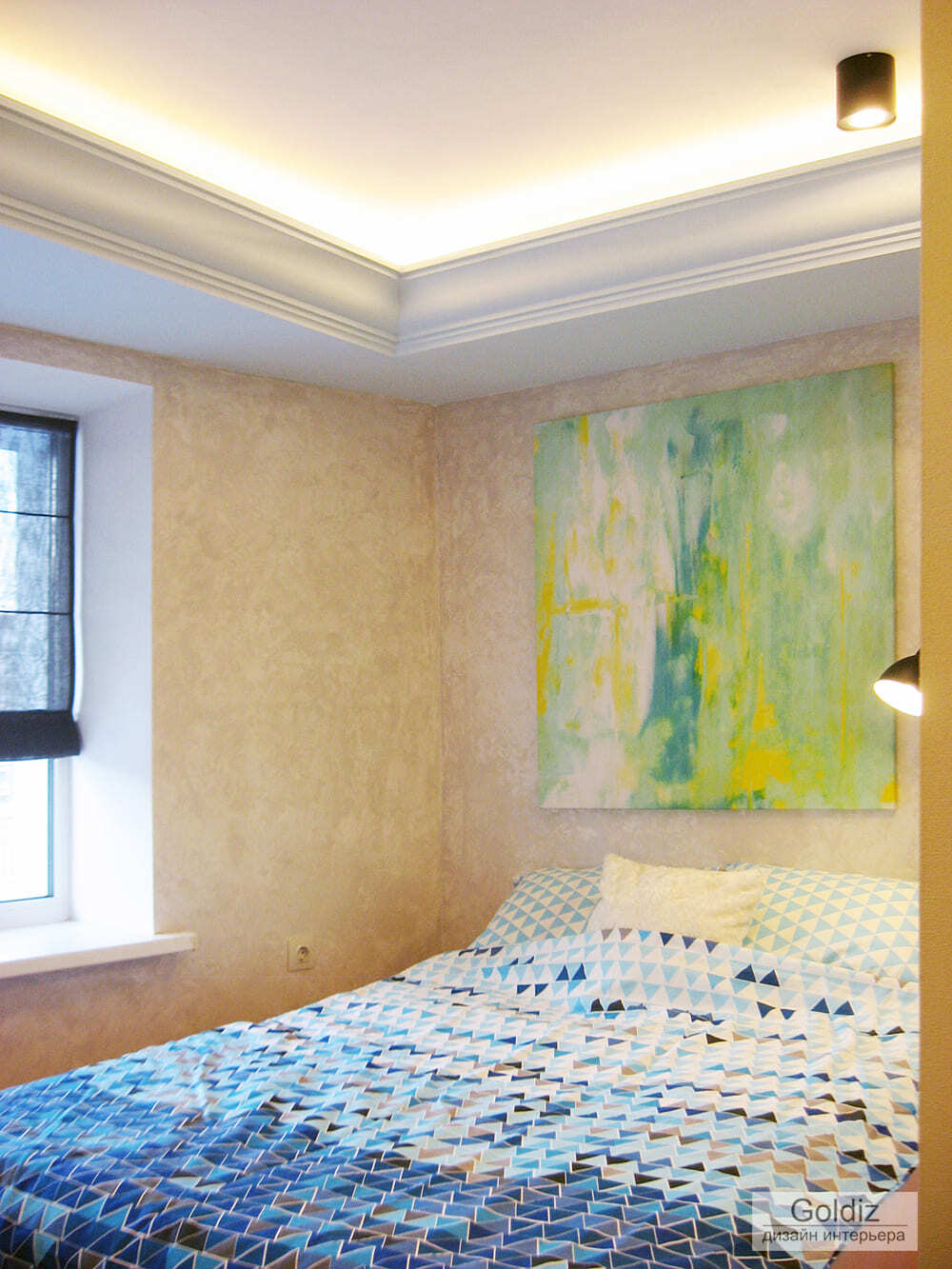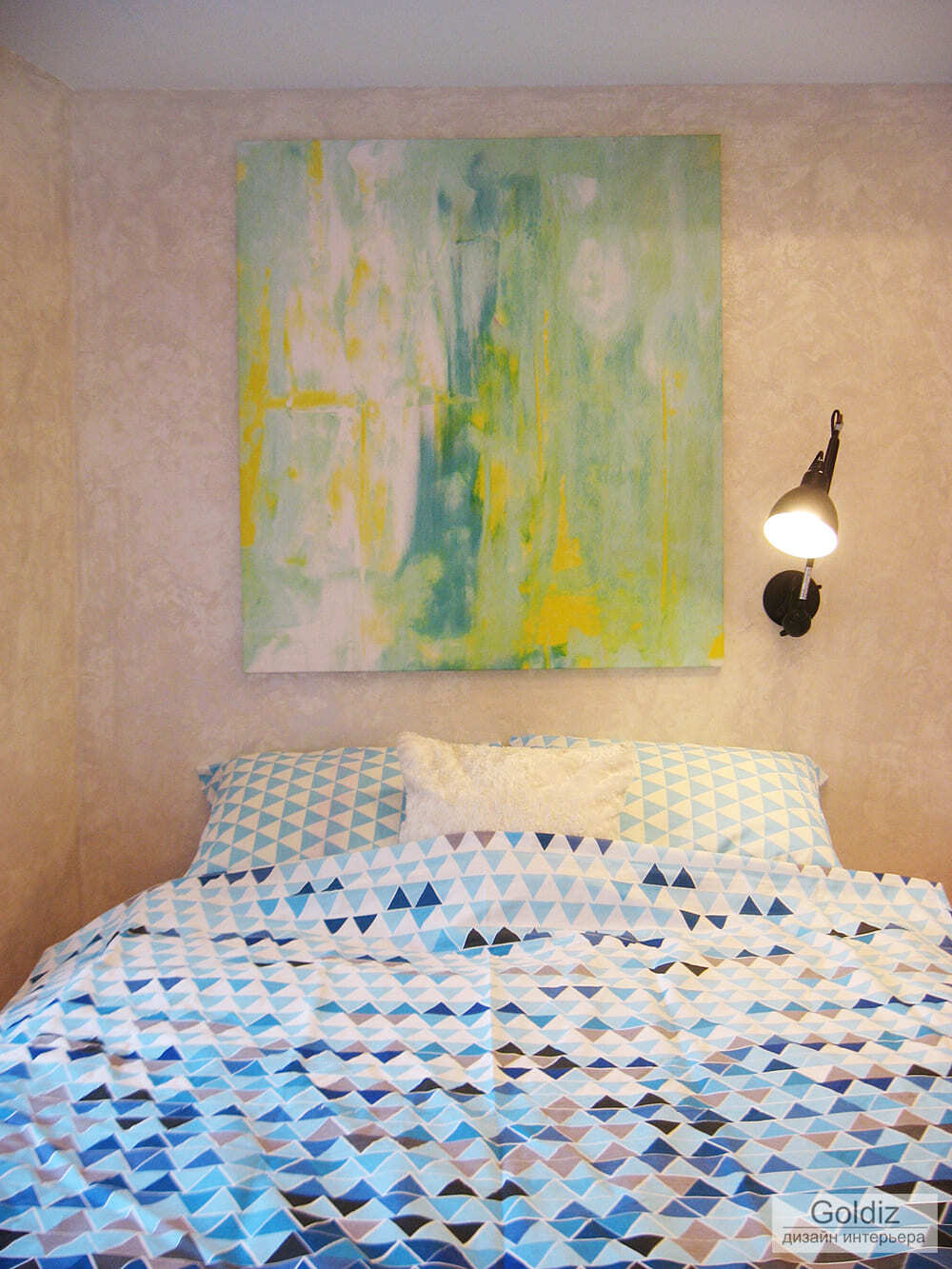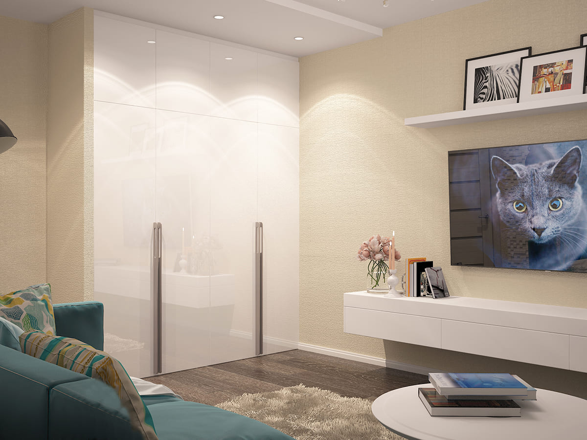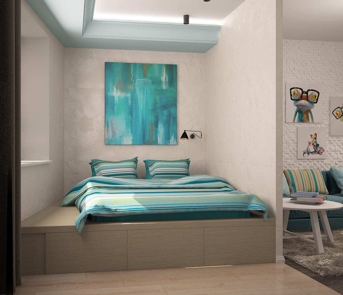 Дизайн студия Голдиз выполнила дизайн интерьера однокомнатной квартиры. При встречи на объекте было решено разделить гостиную на две зоны- гостиная и спальня, предусмотреть места для хранения крупных вещей. Предпочтения были отданы светлым тонам с яркими элементами декора.