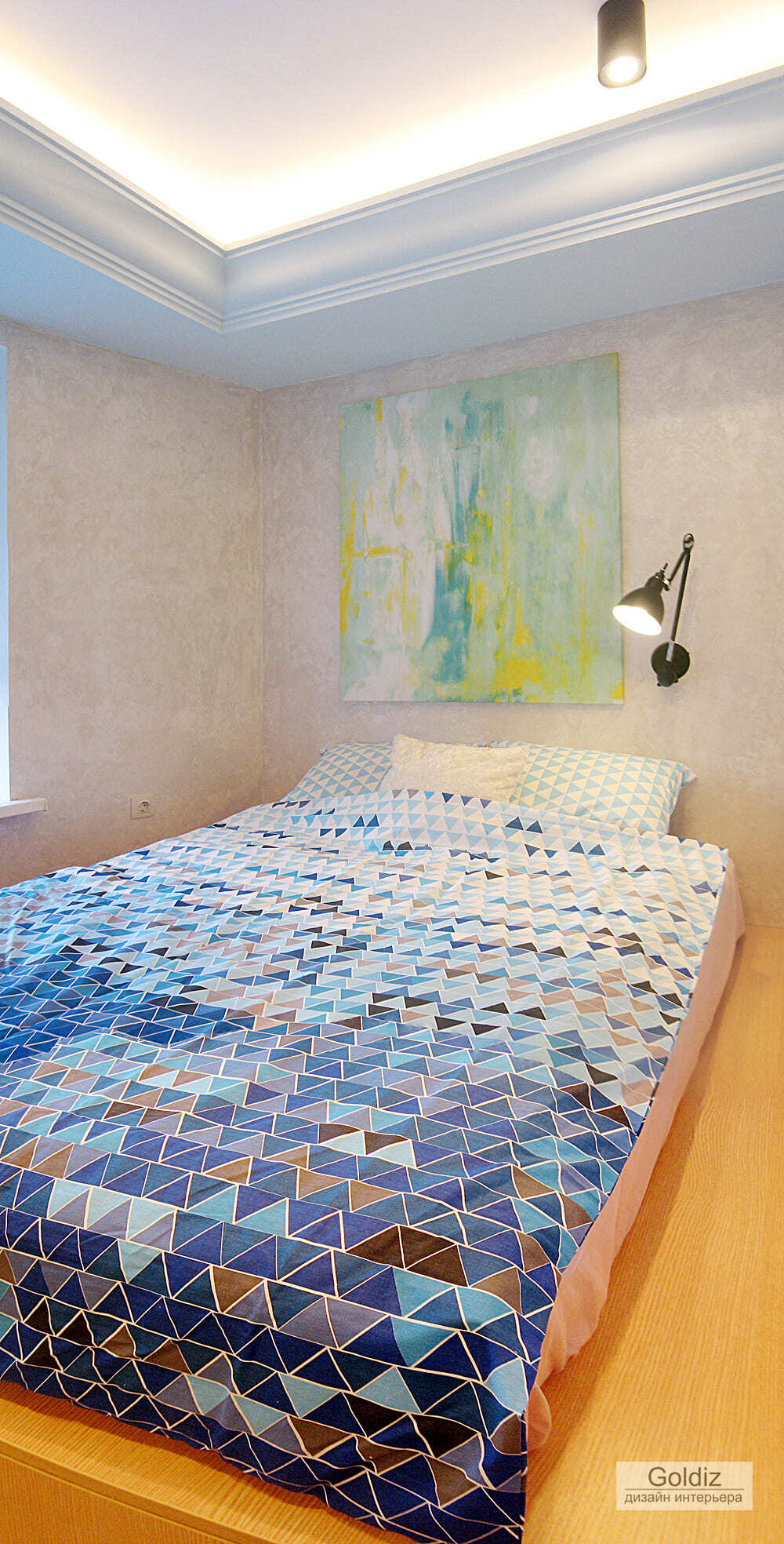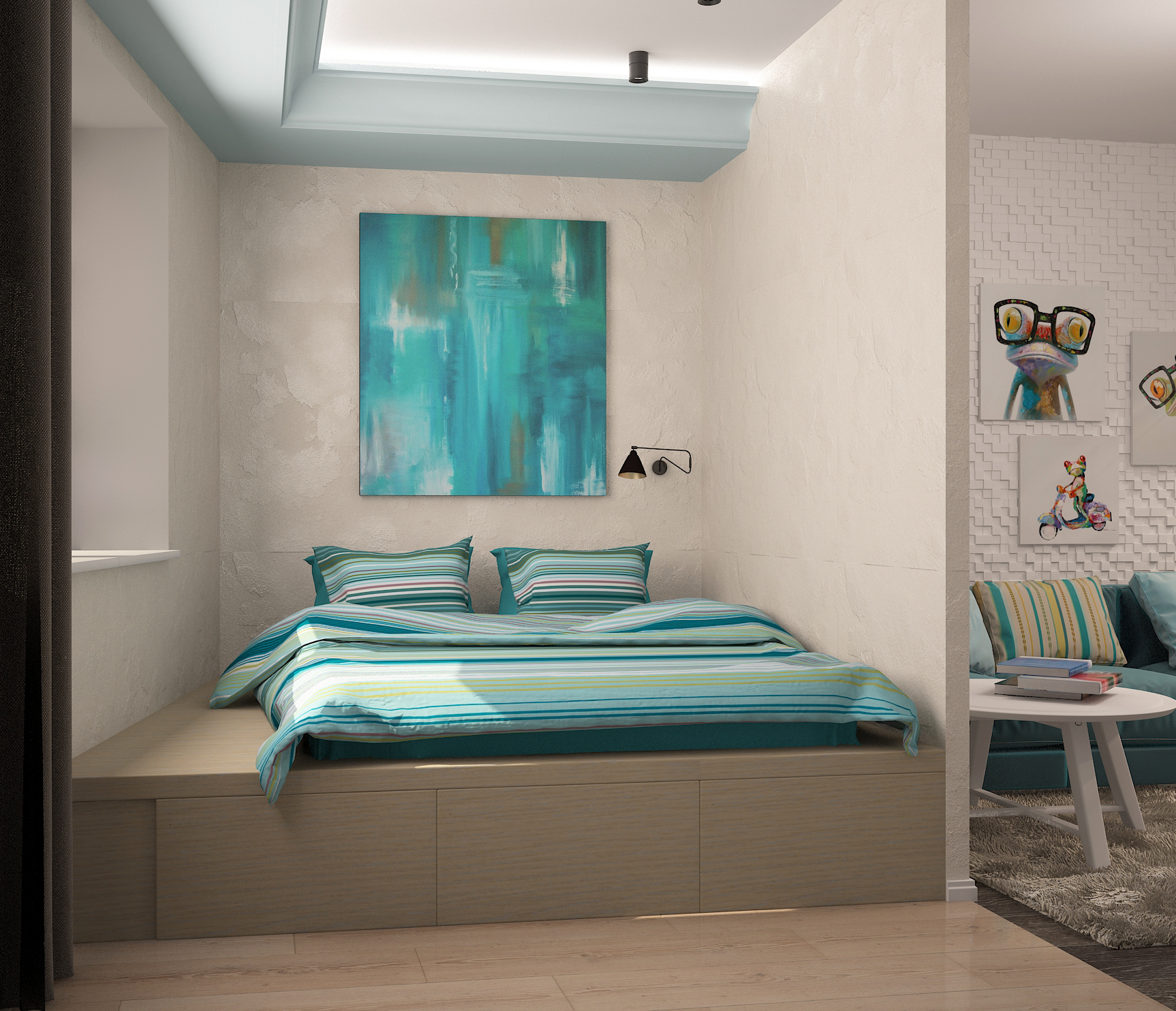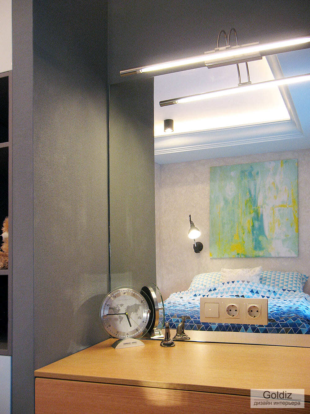 В результате проектирования гостиной все задачи были выполнены. У окна расположилась спальная зона , которая включила в себя кровать-подиум с 3 большими ящиками для постельного белья, напротив расположился небольшой туалетный столик с выдвижным ящиком под различные мелочи, косметику и т.д. Слева от стола -вместительный шкаф. Для того, чтобы облегчить всю эту конструкцию, его фасады было решено сделать глянцевыми и светлыми. Для контраста рядом пущена темно-серая стена. Нужно отметить, что каждая зона дополнительно освещается ( над кроватью висит бра, которая легко вращается и передвигается в нужно место для чтения книг, предусмотрена подсветка зеркала над туалетным столиком, основное освещение играют 4 подвесных цилиндрических точечных светильника). Особенностью данного помещения является наличие массивной балки на потолке над кроватью, которая опускалась на 250мм. Поэтому было решено спрятать ее под потолок из ГКЛ и чтобы облегчить массивную конструкцию пустить широкий карниз со светодиодной подсветкой. Таким образом, дизайн спальни получился функциональным и стильным.
