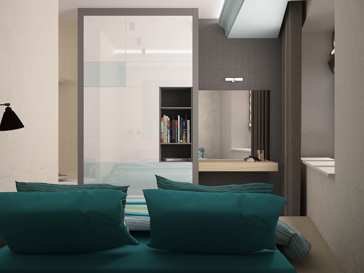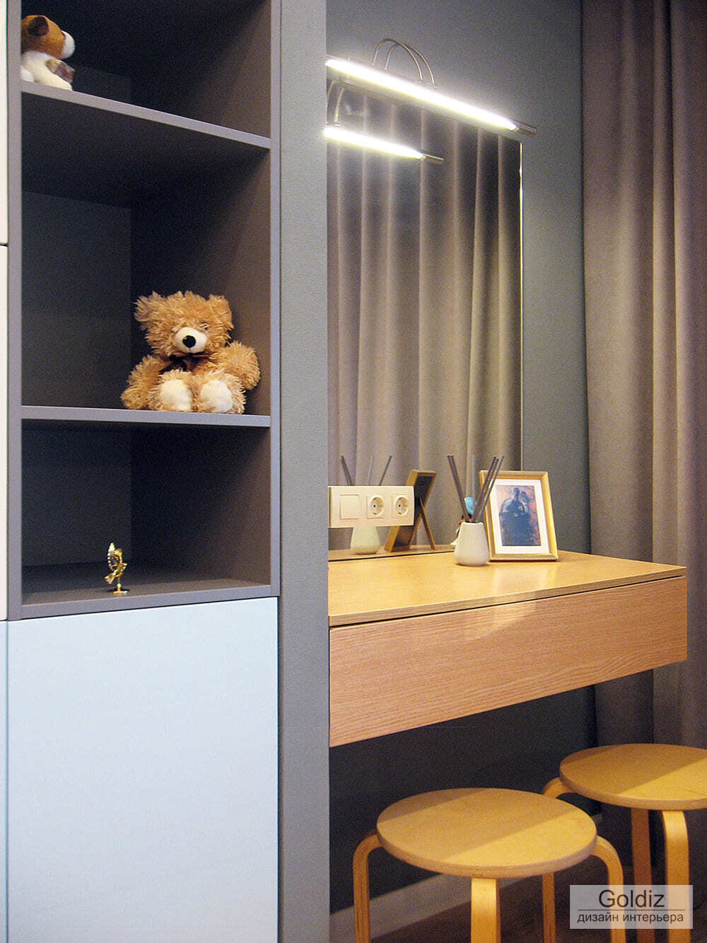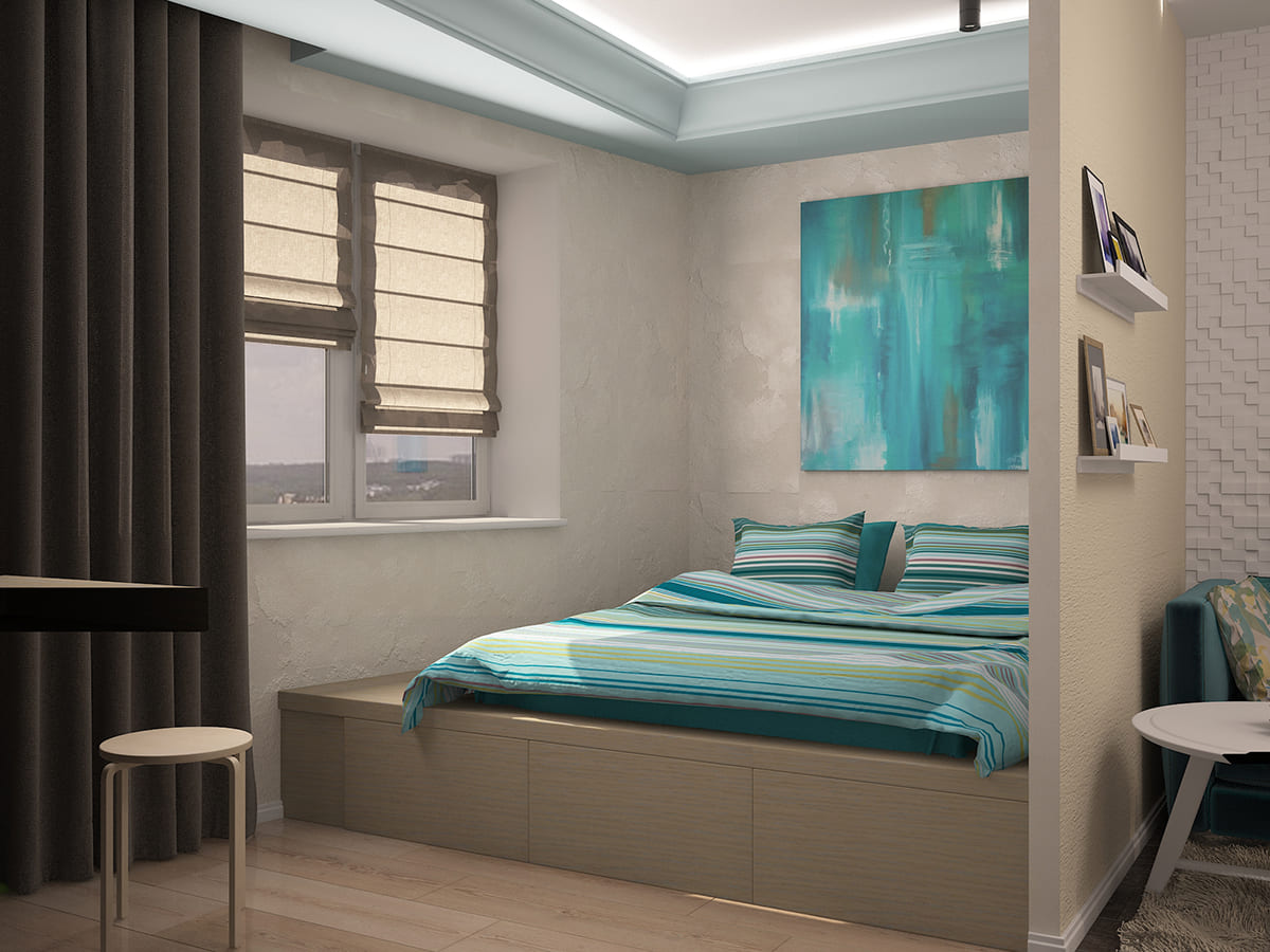 В результате проектирования гостиной все задачи были выполнены. У окна расположилась спальная зона , которая включила в себя кровать-подиум с 3 большими ящиками для постельного белья, напротив расположился небольшой туалетный столик с выдвижным ящиком под различные мелочи, косметику и т.д. Слева от стола -вместительный шкаф. Для того, чтобы облегчить всю эту конструкцию, его фасады было решено сделать глянцевыми и светлыми. Для контраста рядом пущена темно-серая стена. Нужно отметить, что каждая зона дополнительно освещается ( над кроватью висит бра, которая легко вращается и передвигается в нужно место для чтения книг, предусмотрена подсветка зеркала над туалетным столиком, основное освещение играют 4 подвесных цилиндрических точечных светильника). Особенностью данного помещения является наличие массивной балки на потолке над кроватью, которая опускалась на 250мм. Поэтому было решено спрятать ее под потолок из ГКЛ и чтобы облегчить массивную конструкцию пустить широкий карниз со светодиодной подсветкой. Таким образом, дизайн спальни получился функциональным и стильным.