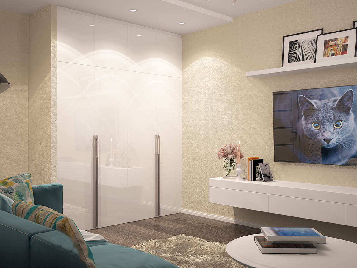 Дизайн гостиной также не уступает по функционалу и красоте. Зона за диваном была выделена 3Д-панелями, слева расположился большой шкаф с белыми глянцевыми фасадами и длинными хромированными стильными ручками.