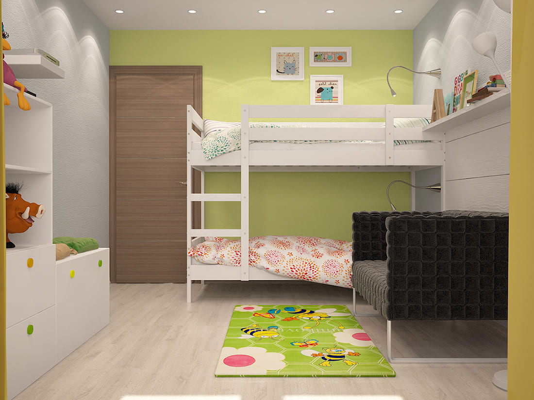 Цветовое решение основано на сочетании мягких нейтральных оттенков и акцентных салатовых деталей. Это создаёт визуально лёгкую и дружелюбную атмосферу, стимулирующую активность и поддерживающую концентрацию. Светлые стены и мебель отражают естественный свет, делая комнату светлой даже в пасмурную погоду. Применение яркого текстиля и декоративных элементов позволяет адаптировать интерьер под возраст ребёнка, не меняя базовых решений.