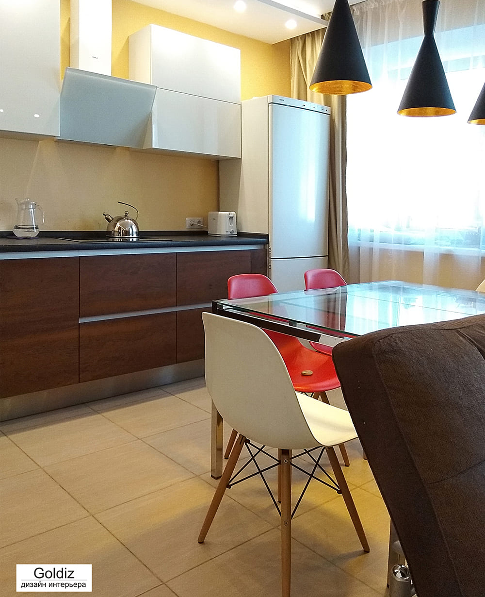 Дизайн интерьера кухни-гостиной построен на контрасте светлого и темного. Современные дизайнерские стулья Eames DSW , люстра Marset Barcelona - Discoco, подвесные светильники Beat Tall - всё это предает изысканность и красоту интерьеру.
