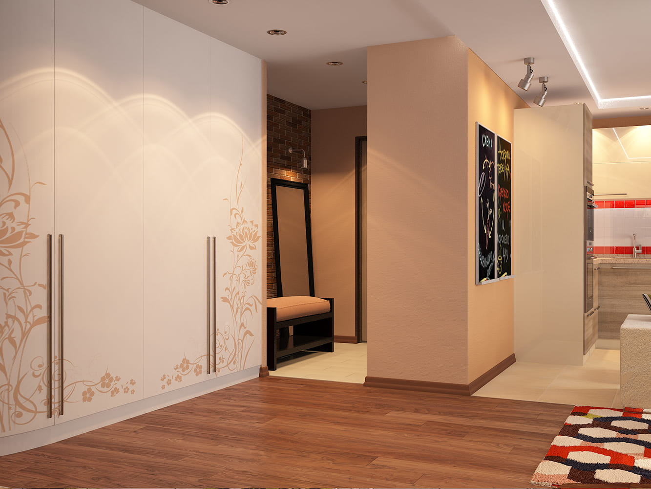 Для практичности в зоне прихожей и кухни на полу положили керамогранит.
