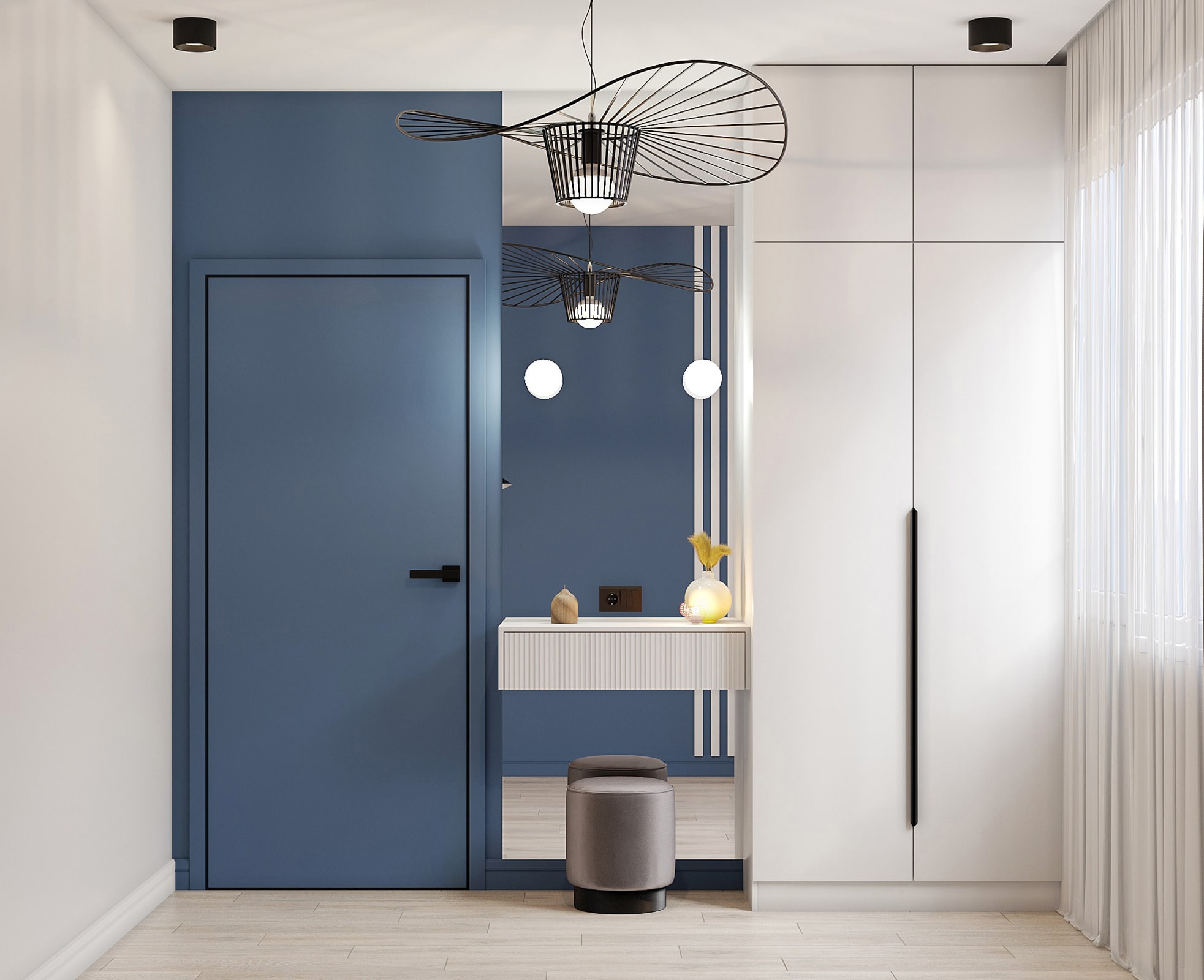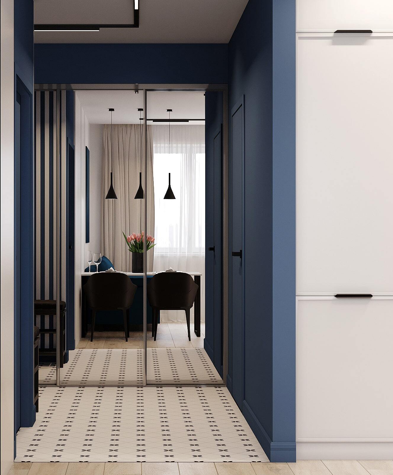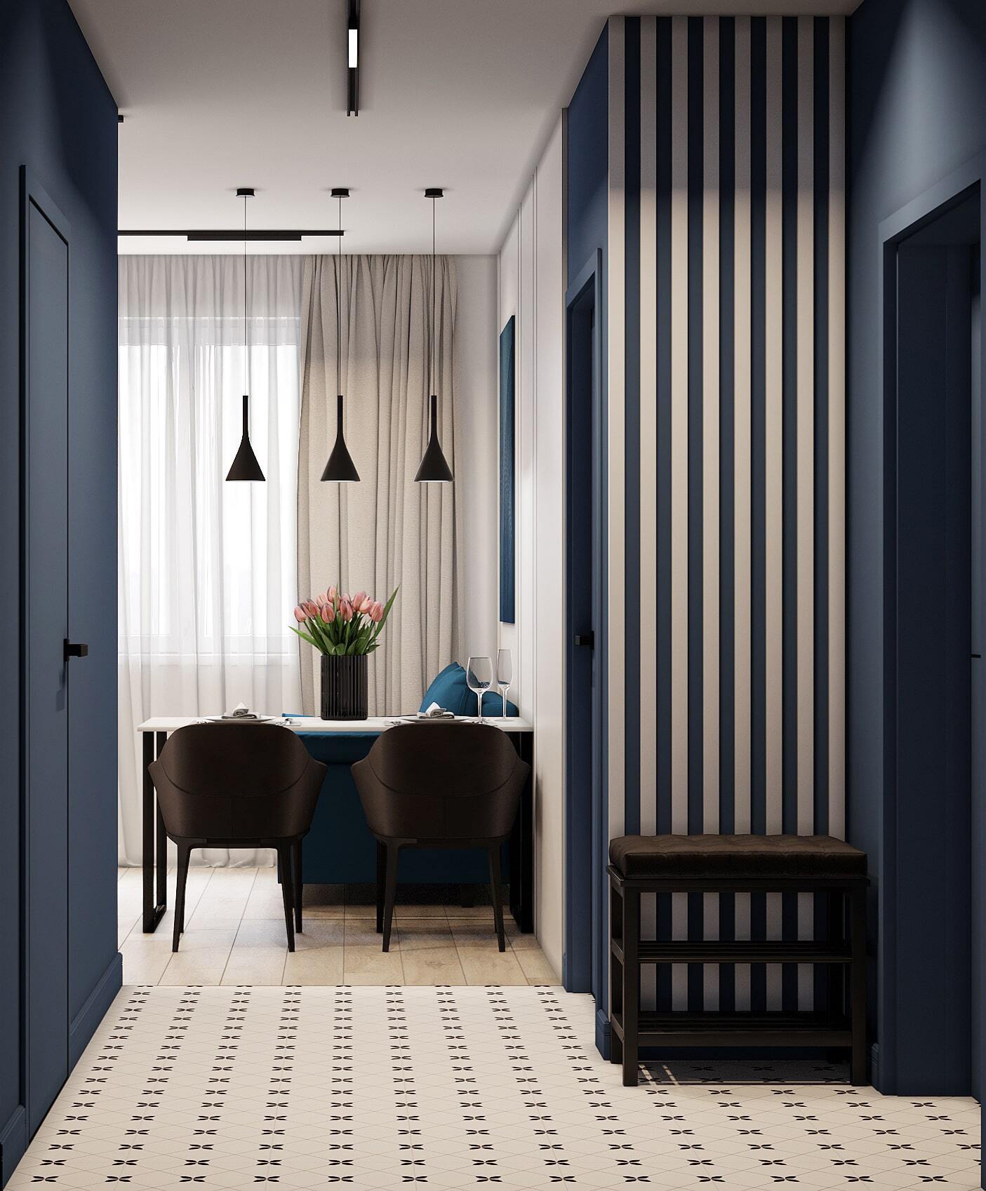 Современный дизайн коридора в квартире сочетает функциональность и стиль. На фото видно, как использование глубокого синего цвета и акцентной полосатой стены создаёт выразительный интерьер. Зеркальный шкаф-купе визуально расширяет узкий коридор и добавляет света, что особенно важно для небольших помещений. Контрастные напольные плитки с геометрическим узором делают пространство более динамичным. Такой интерьер коридора подойдёт как для малогабаритной квартиры, так и для просторного жилья. Фото коридора отлично демонстрируют, как грамотное сочетание цветов и мебели создаёт уютную и практичную атмосферу.