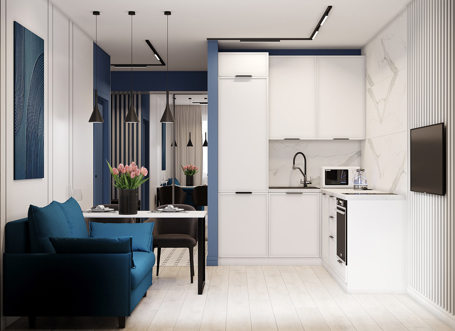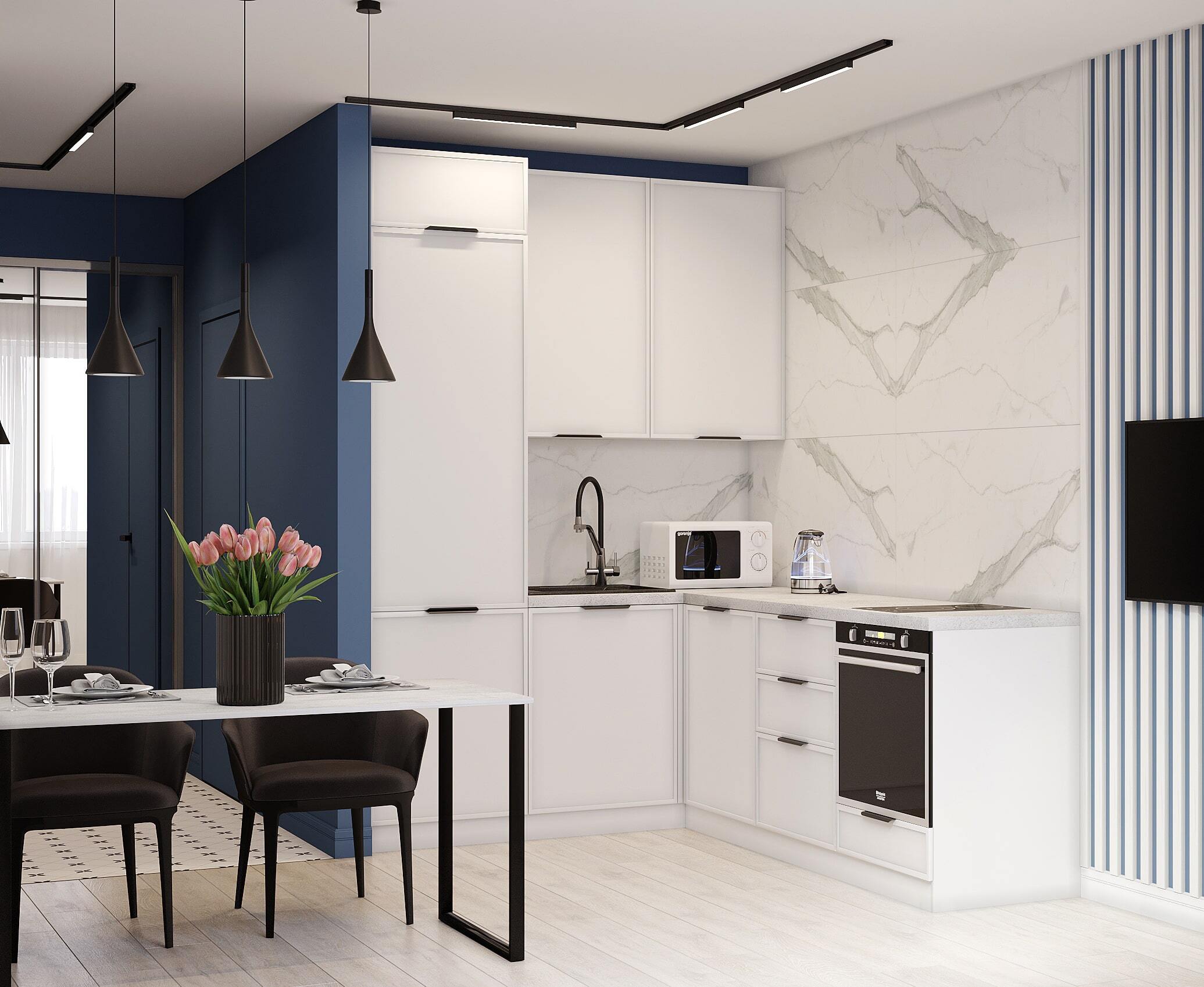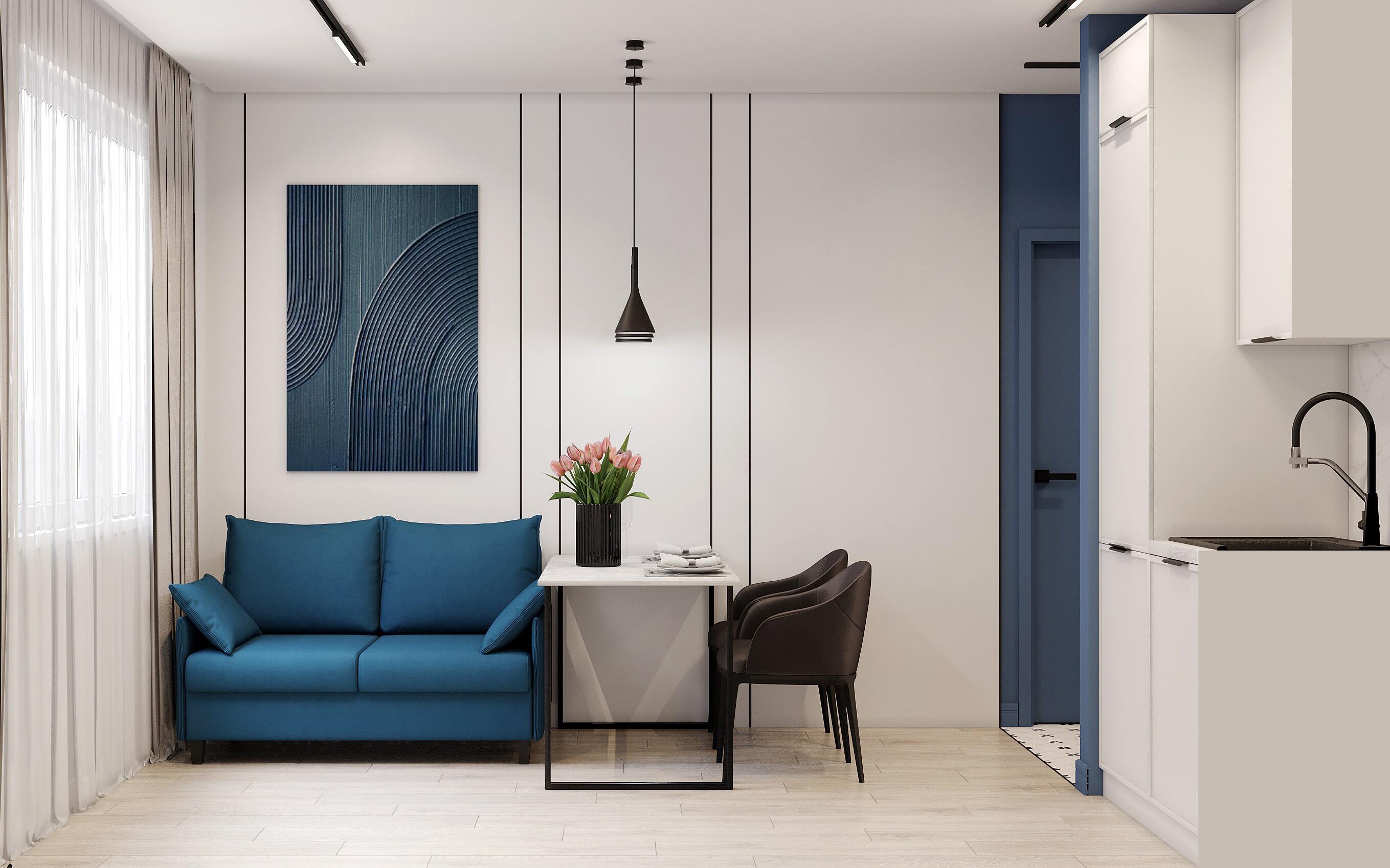 Современный интерьер квартиры всё чаще выполняется в стиле минимализм, где функциональность сочетается с эстетикой. Чистые линии, светлые стены и продуманная планировка создают ощущение простора даже в компактных помещениях. Белая кухня с мраморным фартуком и встроенной техникой гармонично смотрится в сочетании с акцентными элементами — глубоким синим цветом мебели и стен. Такое решение делает интерьер стильным и при этом уютным.
