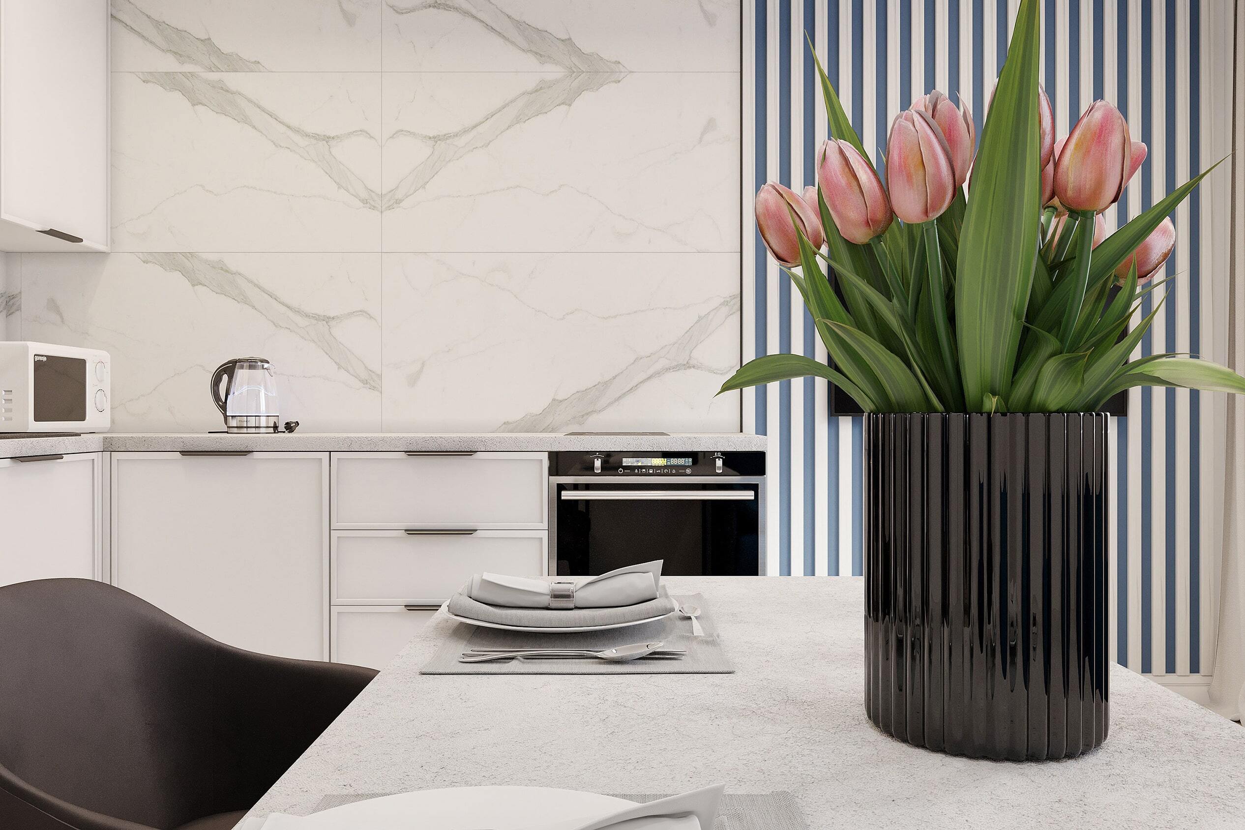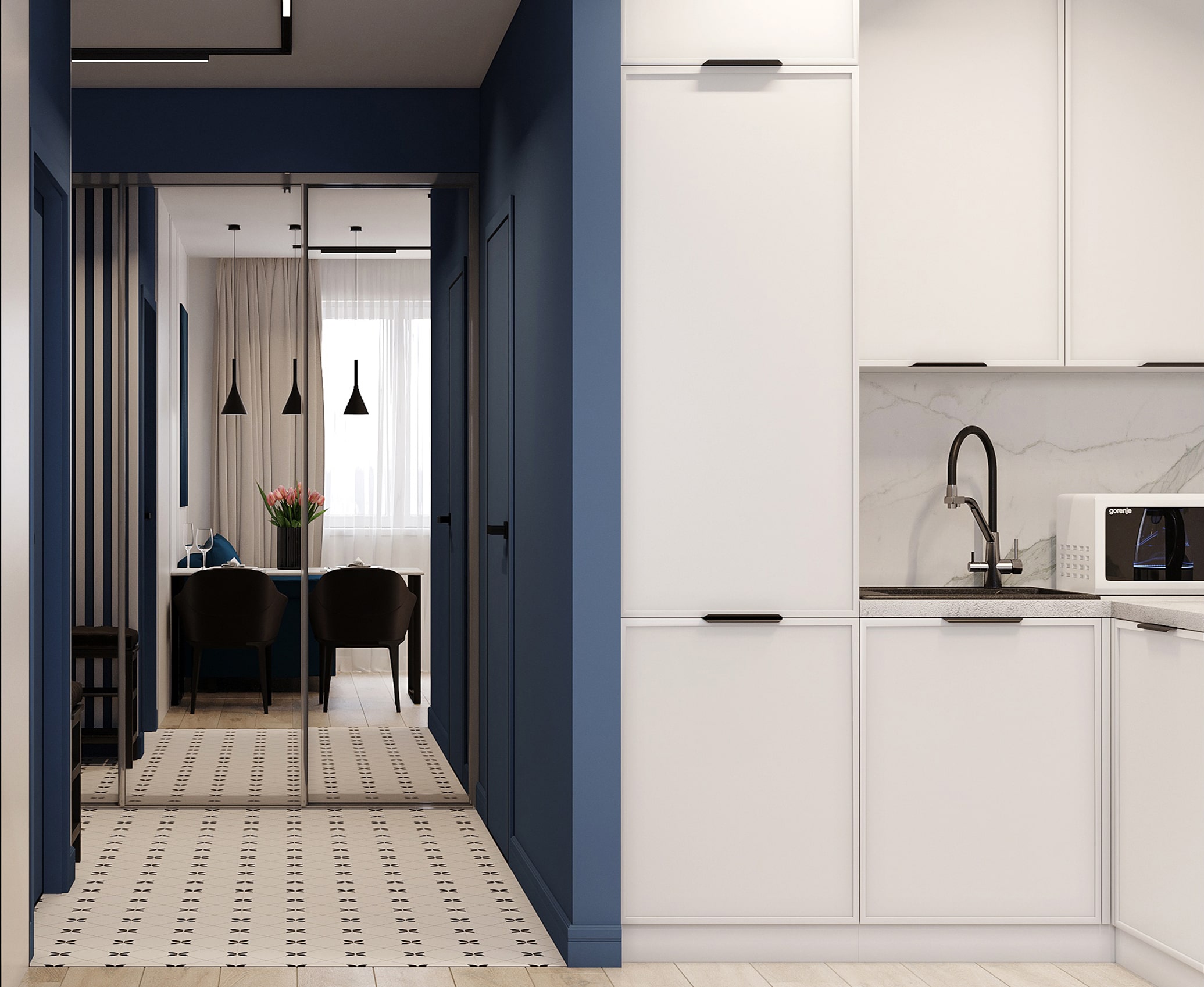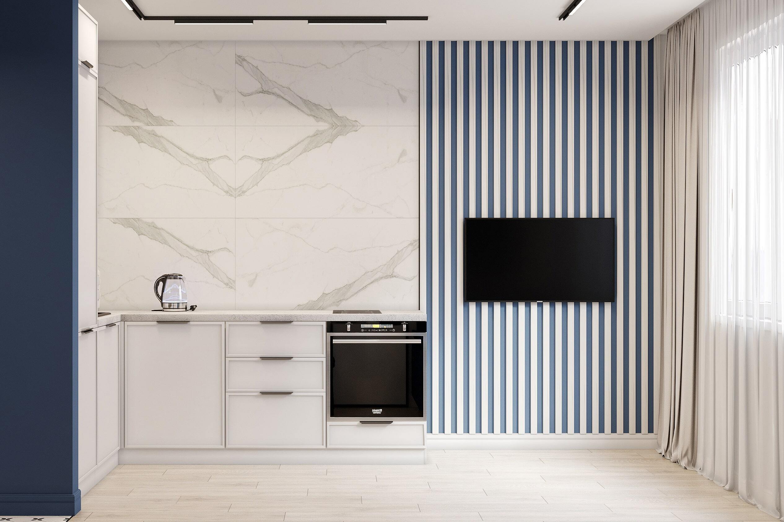 Современный интерьер квартиры всё чаще выполняется в стиле минимализм, где функциональность сочетается с эстетикой. Чистые линии, светлые стены и продуманная планировка создают ощущение простора даже в компактных помещениях. Белая кухня с мраморным фартуком и встроенной техникой гармонично смотрится в сочетании с акцентными элементами — глубоким синим цветом мебели и стен. Такое решение делает интерьер стильным и при этом уютным.